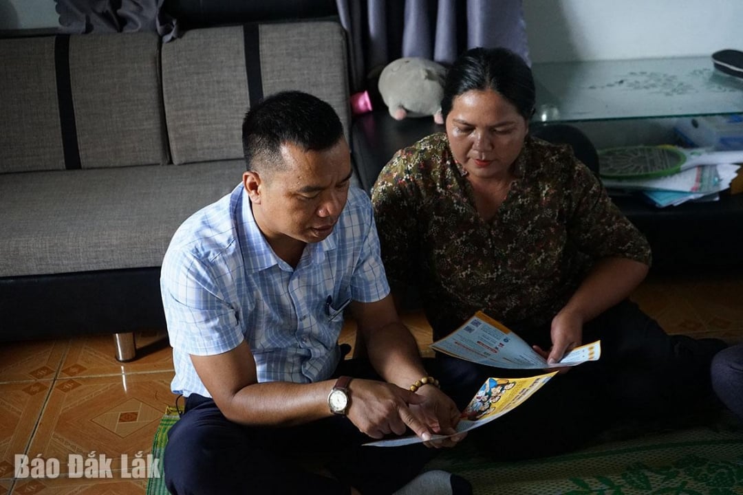 Cán bộ xã Ea Drông vận động người dân tham gia bảo hiểm y tế để được chăm sóc sức khỏe. |
