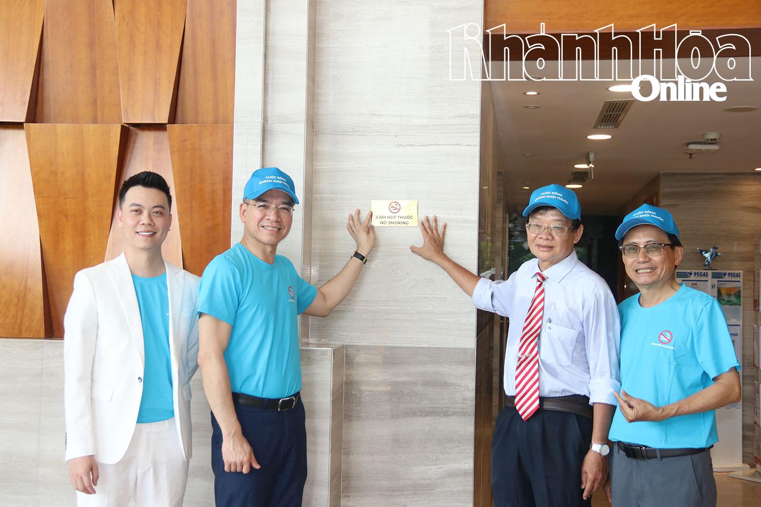 Các đại biểu cùng dán biển "Cấm hút thuốc" tại một khách sạn. |