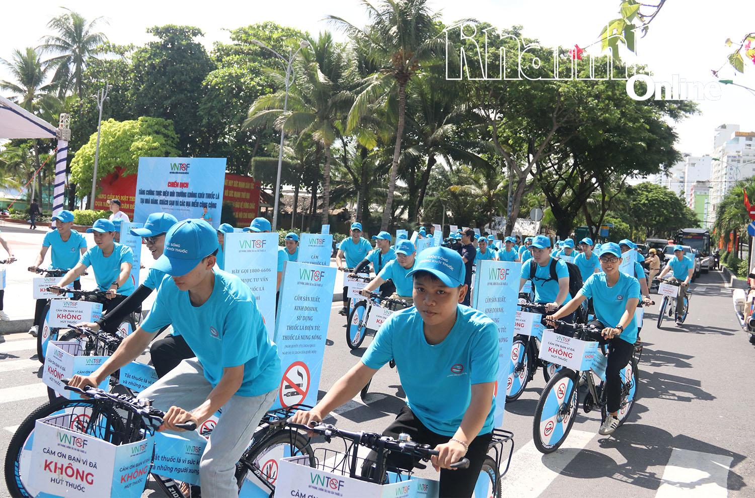 Các bạn trẻ đạp xe diễu hành tuyên truyền trên các tuyến đường. |