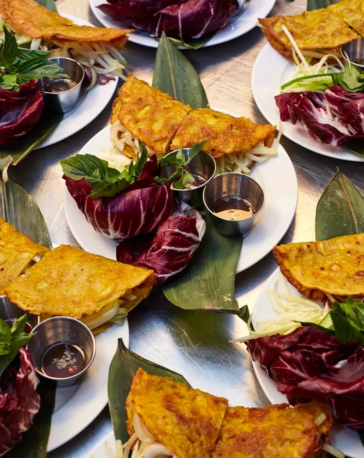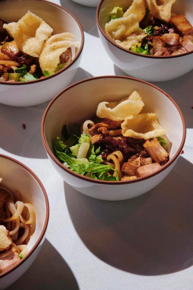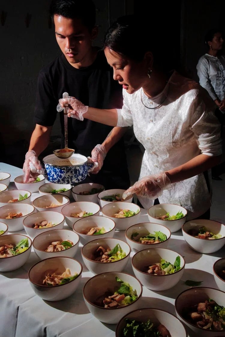 Chẳng hạn, trong sự kiện "Ăn Cỗ" đầu tiên, chị sử dụng loại mì trứ danh của Hội An, được ngâm trong nước tro để tạo nên hương vị đặc trưng, màu vàng óng bắt mắt cùng độ dai giòn hấp dẫn, làm nên những bát cao lầu đậm chất quê hương.