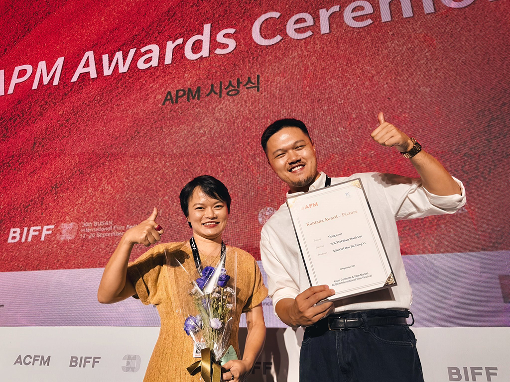 Produzentin Nguyen Huu Thi Tuong Vi und Regisseurin Nguyen Pham Thanh Dat gewannen den Kantana-Preis für das Projekt Flying Cow beim BIFF 2025
