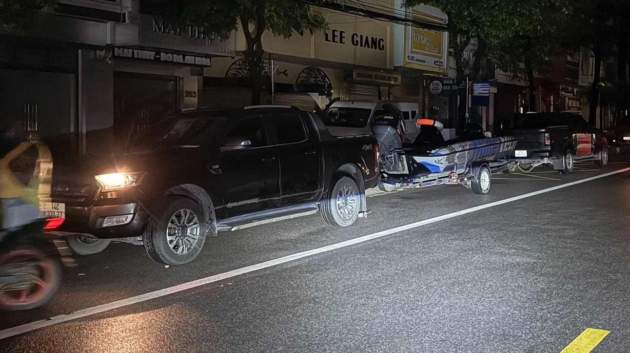 Pickup-Truck schleppt Rettungsboot von Quang Ninh nach Thai Nguyen, um an der Rettung teilzunehmen