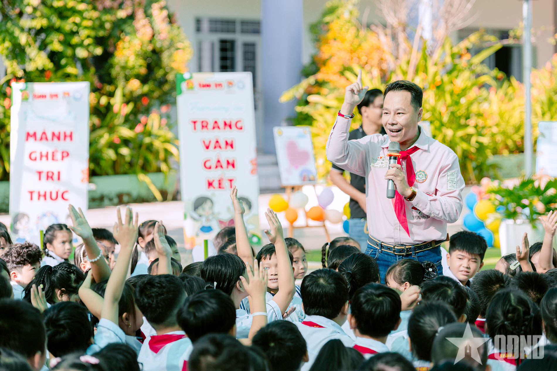 Während des Einführungsprogramms interagierten Teammitglieder und Kinder der Nhi Xuan-Grundschule mit dem Lesekulturbotschafter Trung Nghia – einem Mitglied des Vorstands des Projekts „Reading with Cyclo“ (mit dem Ziel, das Lesen und den Lerngeist zu fördern und das Wissen in der Gemeinschaft und bei den Arbeitnehmern zu verbessern).
