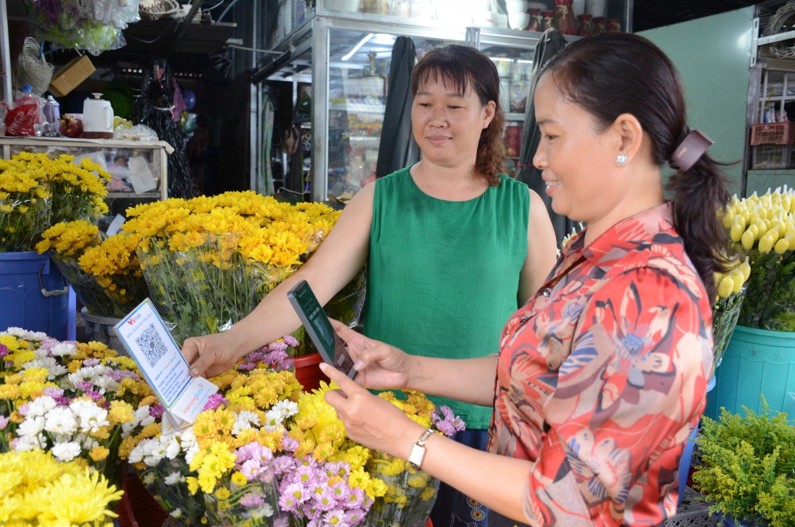 Die Einwohner der Gemeinde Kien Luong bezahlen ihre Einkäufe auf dem Markt über elektronische Anwendungen.