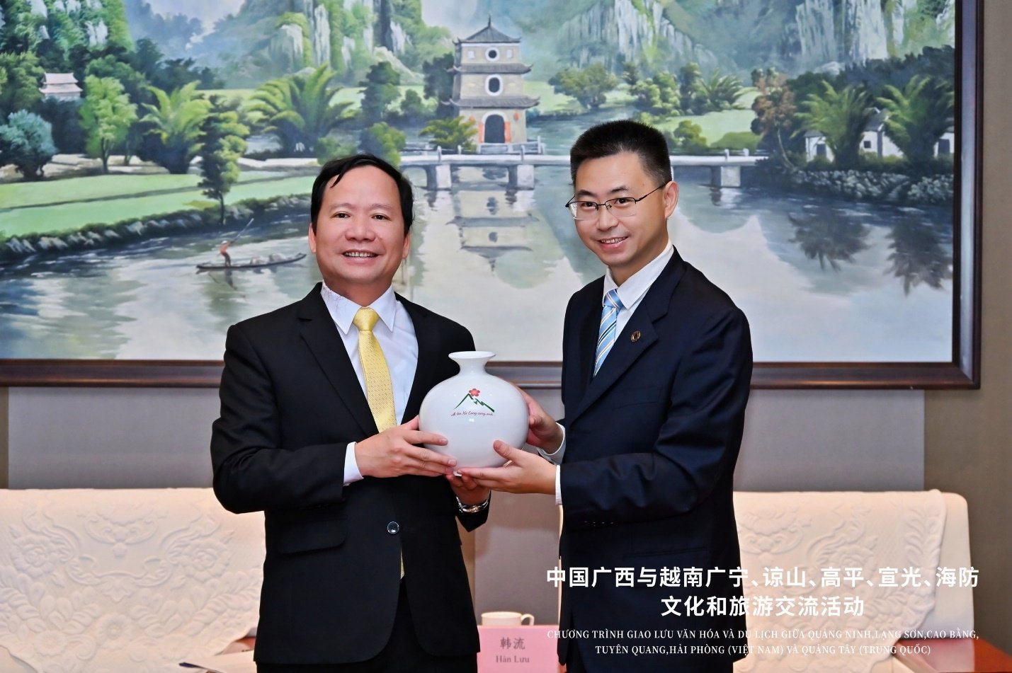 Photo: Mr. Nguyen Dang An - Director of the Department of Culture, Sports and Tourism of Lang Son province (Vietnam) presents a souvenir to Mr. Han Luu - Secretary of the Party Committee of the Department of Culture and Tourism of Guangxi province (China)