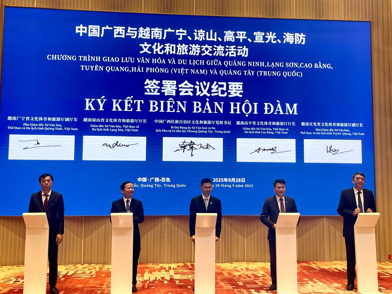 At the end of the meeting, the Departments of Culture, Sports and Tourism of Quang Ninh, Lang Son, Cao Bang, Tuyen Quang provinces (Vietnam) and the Department of Culture and Tourism of Guangxi Zhuang Autonomous Region (China) agreed to sign the minutes of the meeting on friendly exchange and cooperation in the next 5 years, including 6 basic contents. The Parties agreed to report to the Party Committee and the Government (People's Committee) for consideration and create conditions so that from 2026 onwards, after the Spring Meeting Program between the Secretaries of the Provincial Party Committees of Quang Ninh, Lang Son, Cao Bang, Tuyen Quang, Hai Phong (Vietnam) and the Secretary of the Guangxi Regional Party Committee (China) and the Joint Working Committee Conference, the cultural and tourism exchange program between the provinces and cities of Quang Ninh, Lang Son, Cao Bang, Tuyen Quang, Hai Phong (Vietnam) and Guangxi (China) will be held at the same location; The cultural and tourism agencies of the provinces of Quang Ninh, Lang Son, Cao Bang, Tuyen Quang (Vietnam) and Guangxi (China) actively reported and asked for opinions from the authorities (Provincial People's Committees), and at the same time, according to the processes and procedures of each side, requested the superiors to consider signing the Agreement on orientations on border tourism cooperation and the official Border Tourism Cooperation Agreement between the provincial authorities (People's Committees) of Quang Ninh, Lang Son, Cao Bang, Tuyen Quang (Vietnam) and (People's Government) of Guangxi (China); agreed to actively strengthen cooperation, promote border tourism development, join hands to build unique tourist destinations on the Vietnam - China border; expected to expand the scope of tourism for Vietnamese and Chinese groups using border tourism passes to be allowed to enter Guangxi and the provinces of Quang Ninh, Lang Son, Cao Bang, Tuyen Quang according to the laws of Vietnam and China.