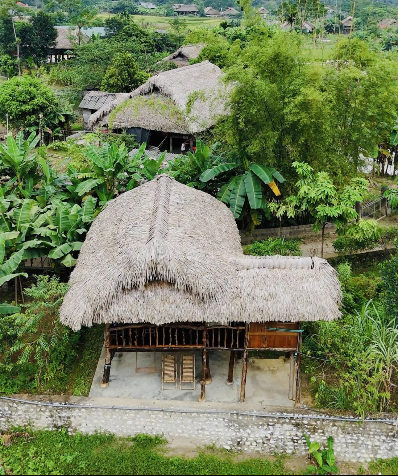 The guests sleep in a traditional stilt house. In the morning, when they wake up and open the door of the stilt house, they see clouds hovering over the village and smoke from the kitchens curling around the palm-leaf roofs.