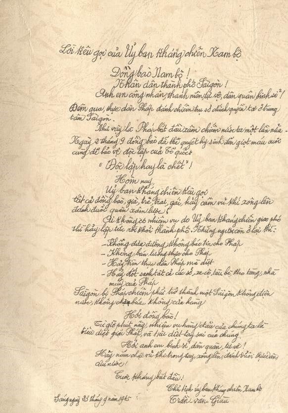 Finally, the conference decided to simultaneously ask for the opinion of the Party Central Committee and President Ho to launch the People's Resistance War, "the generals at the border cannot wait for the king's order to fight the enemy when the enemy attacks across the border", if they do not fight back immediately, if they do not fight back immediately, the enemy will have time and conditions to expand their invasion, but they will never stop, they will lose land and revolutionary prestige. Of course, they will fight and negotiate as their ancestors did if they have the conditions. On the morning of September 23, 1945, Chairman of the Southern Resistance Committee Tran Van Giau sent an appeal: "All compatriots, old and young, men and women, take up arms and charge forward to repel the invaders! Dear soldiers, militiamen, and self-defense members! Hold your weapons in your hands, charge forward to repel the French colonialists, save the country. The resistance war has begun!". It was not only an order but also the determination of an entire nation that would never be enslaved again.