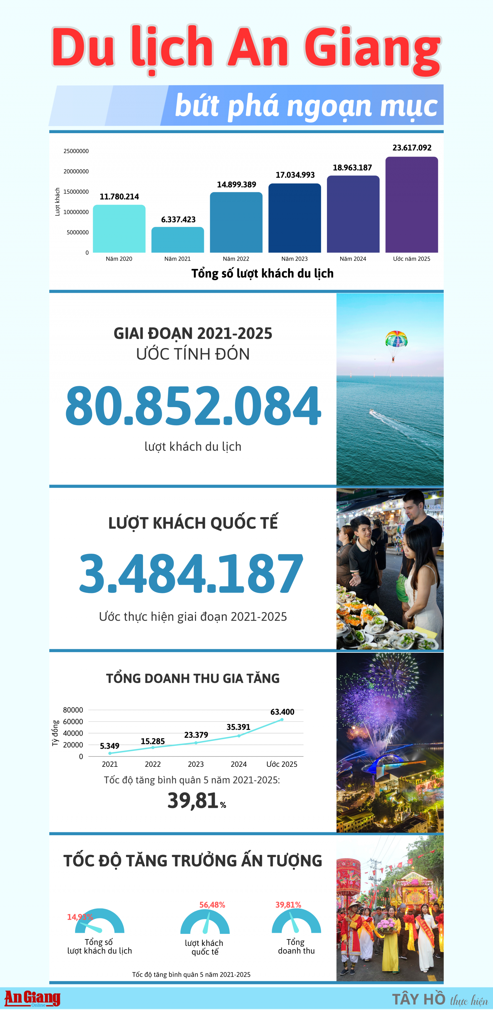 An Giang tourism in the period of 2021 - 2025 marked a spectacular breakthrough with more than 80.8 million visitors, exceeding the planned target and affirming the attractiveness of the destination. The number of international visitors increased rapidly, reaching over 3.4 million. Tourism revenue reached more than 142,800 billion VND, with an average growth rate of nearly 40%/year - becoming one of the new driving forces for the province's socio-economic growth.