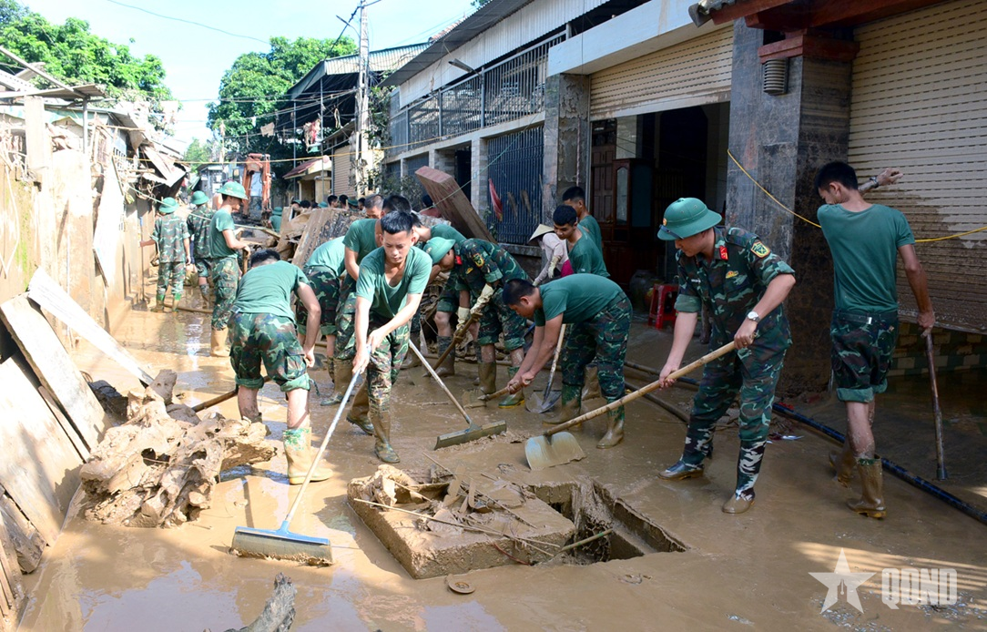 Officers and soldiers of Regiment 1, Division 324 (Military Region 4) help people in Tuong Duong commune (Nghe An) overcome storm No. 3 (July 2025). Photo: KHÁNH TRINH
