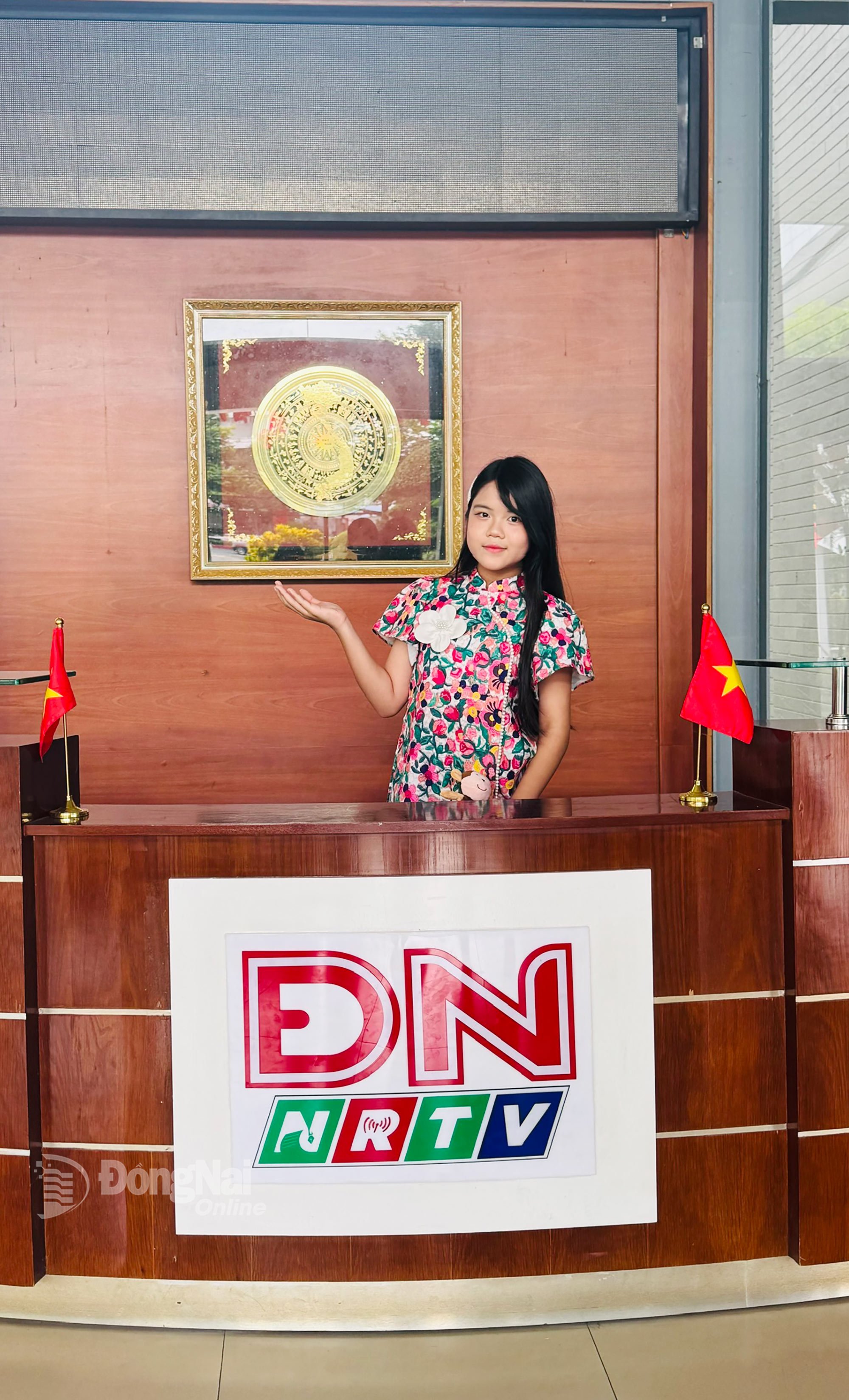 Child singer Minh Vy takes photos at Dong Nai Newspaper, Radio and Television. Photo: Minh Hue |