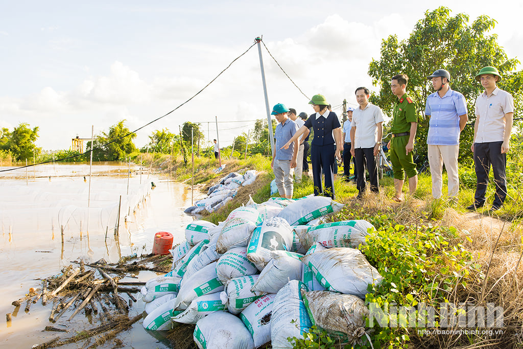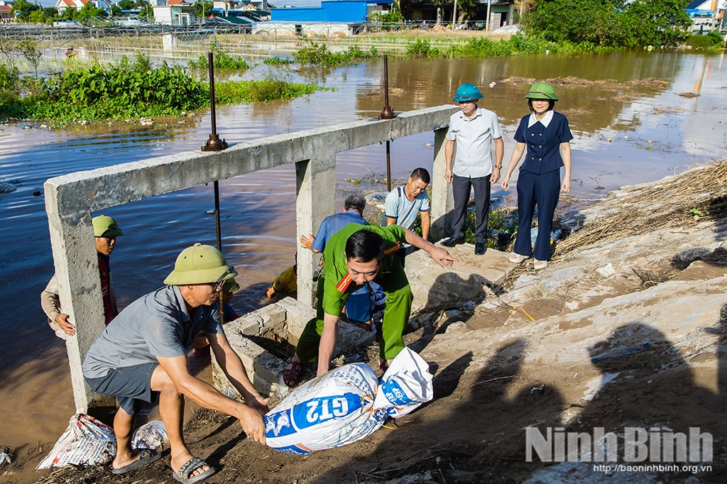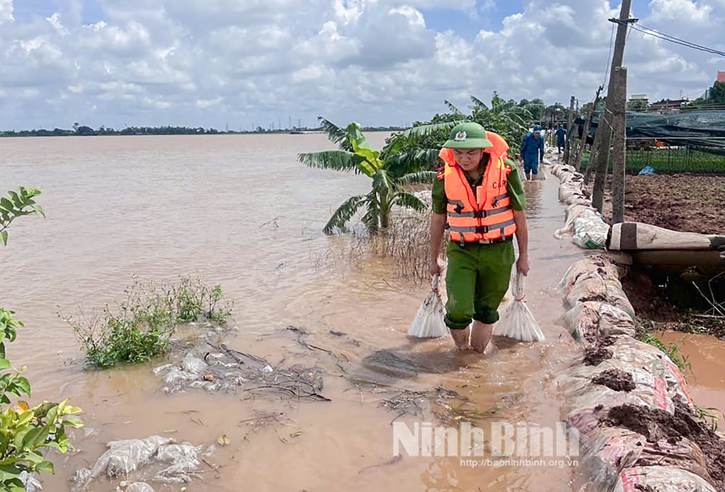 Implementing the "4 on-the-spot" motto, the ward has mobilized a shock force of about 500 people (including military , Youth Union, forces of residential groups, and security groups) ready to perform rescue and dike protection tasks. Regarding materials, the ward has prepared thousands of sacks of sand and soil, sealed off leaking locations, and purchased more sand, rocks, bamboo poles, and tarpaulins to handle emergency incidents.