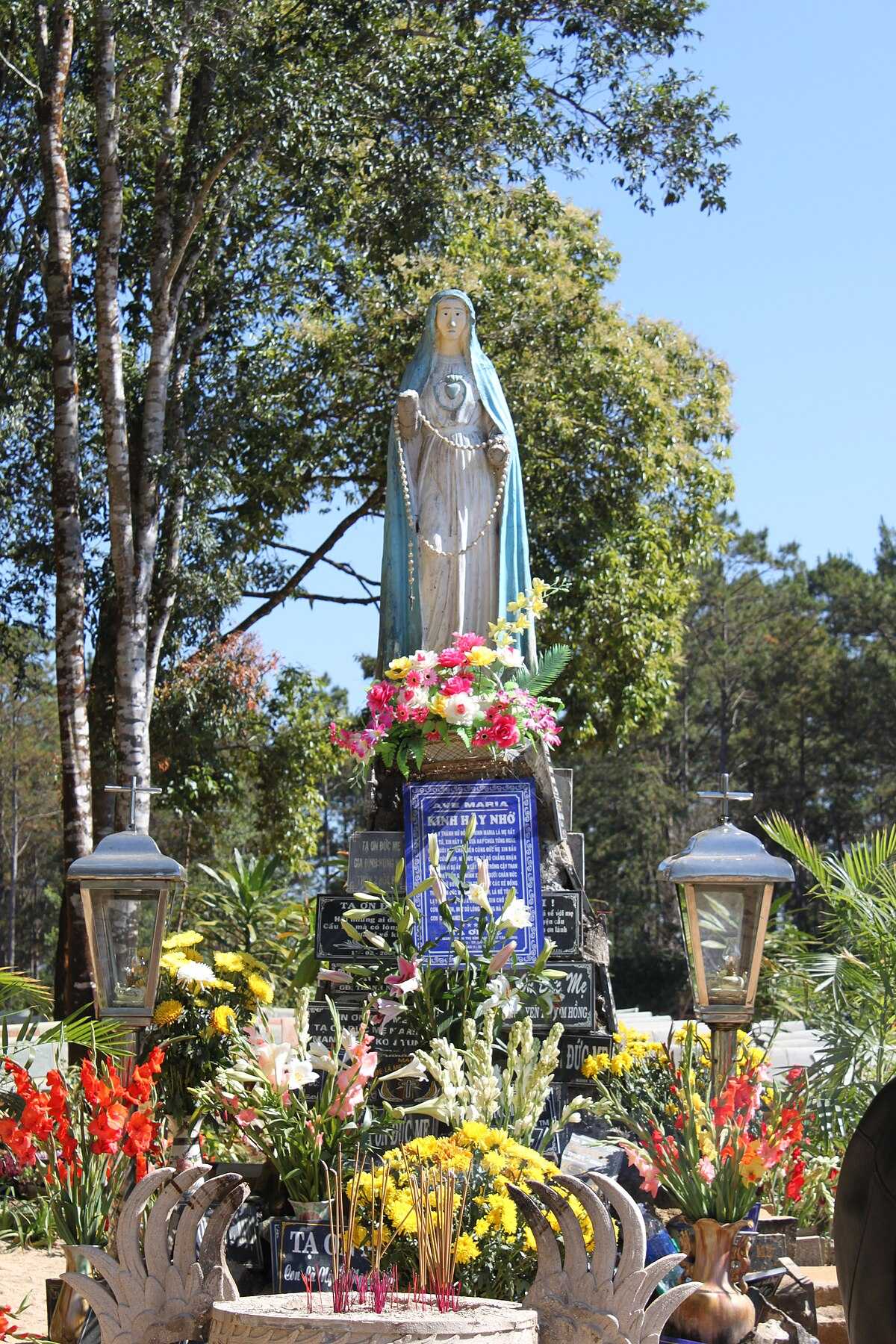 Located on a high hill, the space around the center is always airy with fresh, cool air. From here, visitors can admire the wild beauty of the vast mountains and forests, the green primeval forests and the majestic scenery typical of the Central Highlands. It is the harmony between spiritual elements and natural landscapes that has turned this place into one of the Mang Den tourist destinations that attracts a large number of pilgrims and tourists every year.