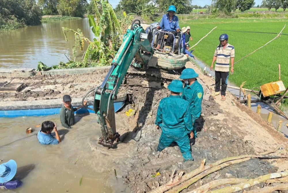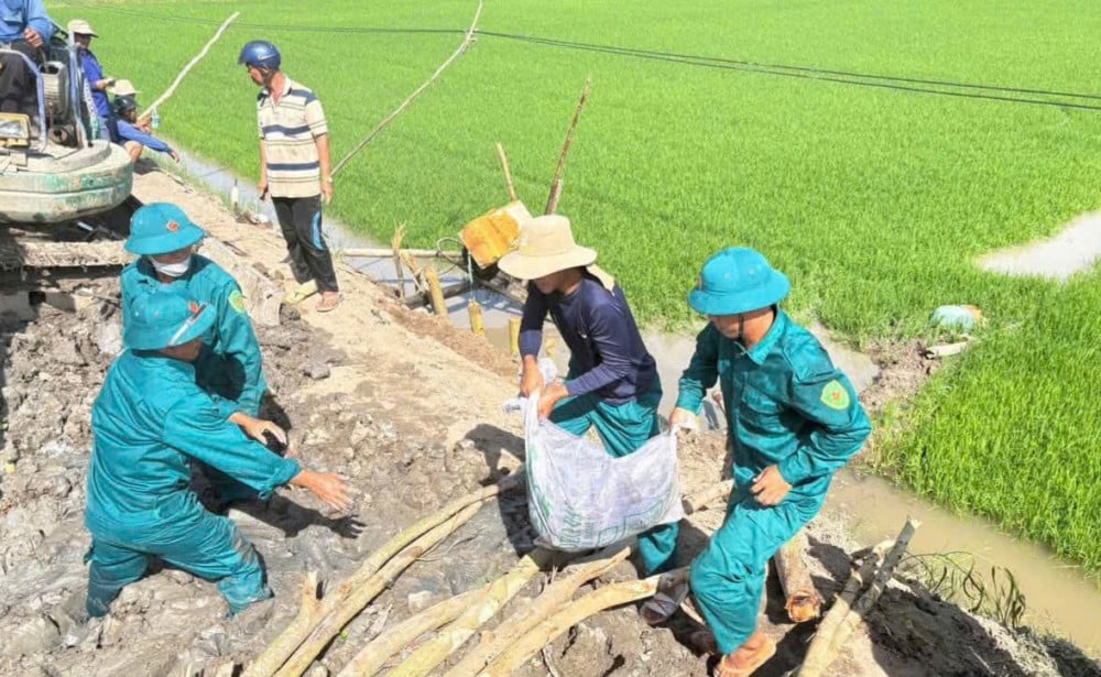 Faced with the above situation, Vinh Chau commune mobilized machinery, along with dozens of officers, militia soldiers, union members, and youths, coordinating with people present in this vulnerable area to reinforce, fill in leaks, build earth bags, and patch the dike body to prevent water from overflowing into rice fields, and protect the safety of people's rice production areas.