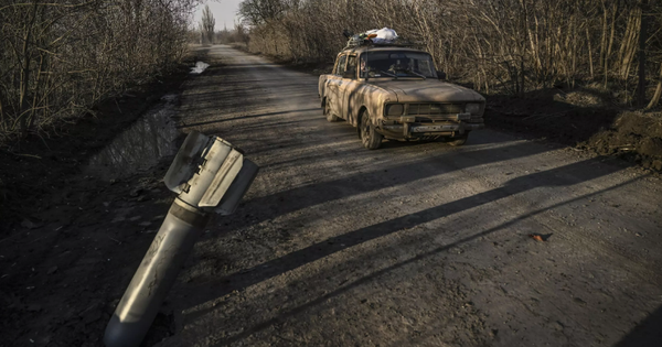 2023年3月、ロシアによるウクライナでの「特別軍事作戦」の最中、ドネツィク州バフムート近郊のハシフ・ヤルで、地面に固定されたミサイルの尾部を車が通り過ぎる。写真:France24