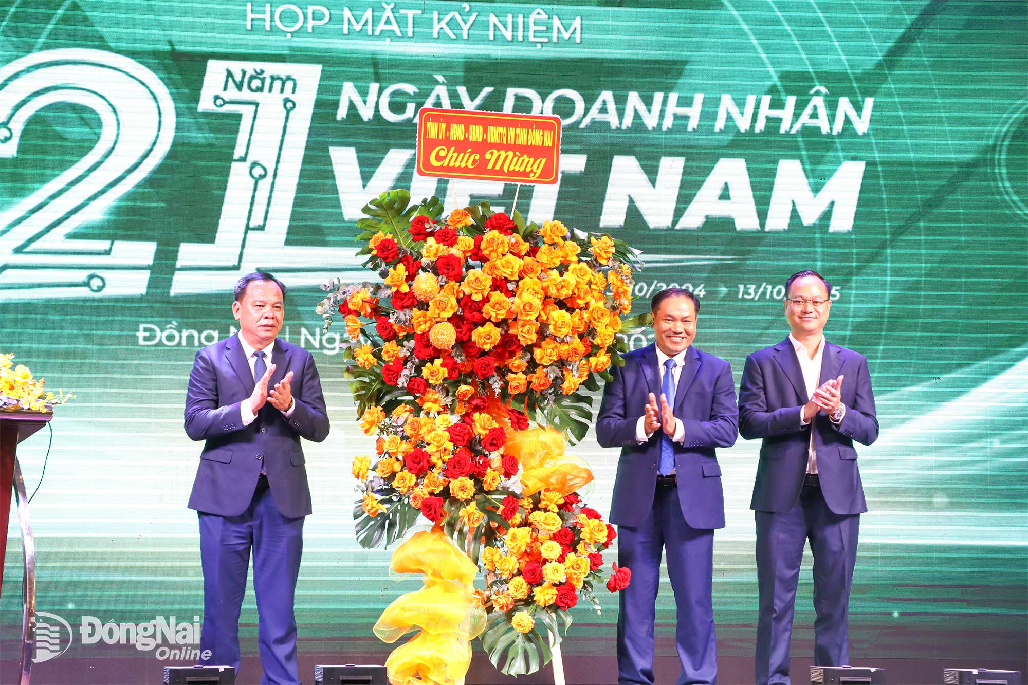 ドンナイ省党委員会副書記、人民委員会委員長のヴォー・タン・ドゥック氏がベトナム起業家の日を祝って花束を贈呈した。写真:ヴォン・テ |