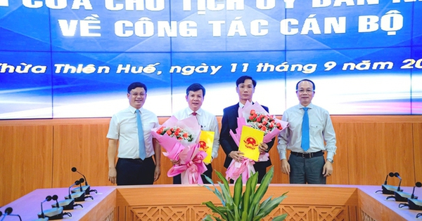 トゥアティエン・フエ省人民委員会の指導者たちは、省教育訓練局長のグエン・タン氏と新副局長のグエン・ヴィン・フン氏に祝意を表し、花束を贈呈した。写真:NH