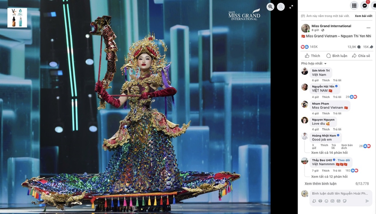 10月14日午後の早い時点で、インスタグラムの「ミス・グランド・インターナショナル」では、イェン・ニーさんが民族衣装を着てパフォーマンスする動画が1,060万回以上再生され、95万件の「いいね!」、そしてこのパフォーマンスを称賛する6,800件以上のコメントが寄せられた。
