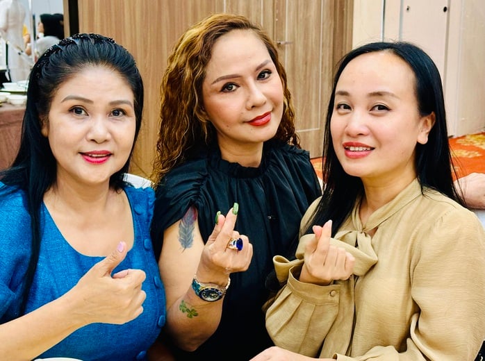 ពីឆ្វេងទៅស្តាំ៖ សិល្បករប្រជាជន Bich Ngoan សិល្បករប្រជាជន Kieu Oanh សិល្បករប្រជាជន Thu Huyen ក្នុងសិក្ខាសាលា