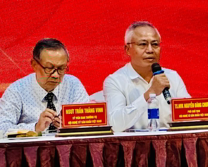 វិចិត្រករកិត្តិយស Nguyen Thang Vinh និងបណ្ឌិតអ្នកនិពន្ធរឿង Nguyen Dang Chuong - អនុប្រធានសមាគមសិល្បករដំណាក់កាលវៀតណាមបានចូលរួមជាប្រធានសិក្ខាសាលា។