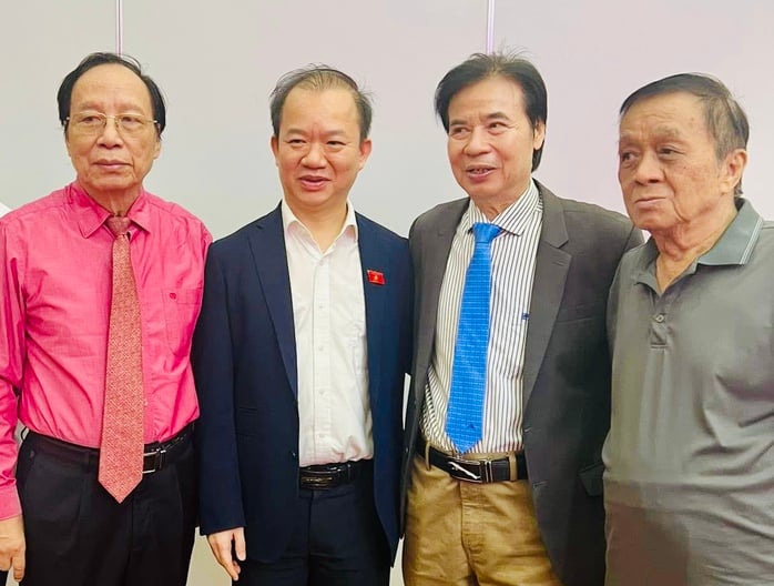 ពីឆ្វេងទៅស្តាំ៖ សិល្បករប្រជាជន Le Tien Tho សាស្ត្រាចារ្យរងបណ្ឌិត Bui Hoai Son - សមាជិកអចិន្ត្រៃយ៍នៃគណៈកម្មាធិការវប្បធម៌ និងអប់រំ សិល្បករប្រជាជន និងជានាយក Giang Manh Ha អ្នកស្រាវជ្រាវ Nguyen The Khoa នៅសិក្ខាសាលា។