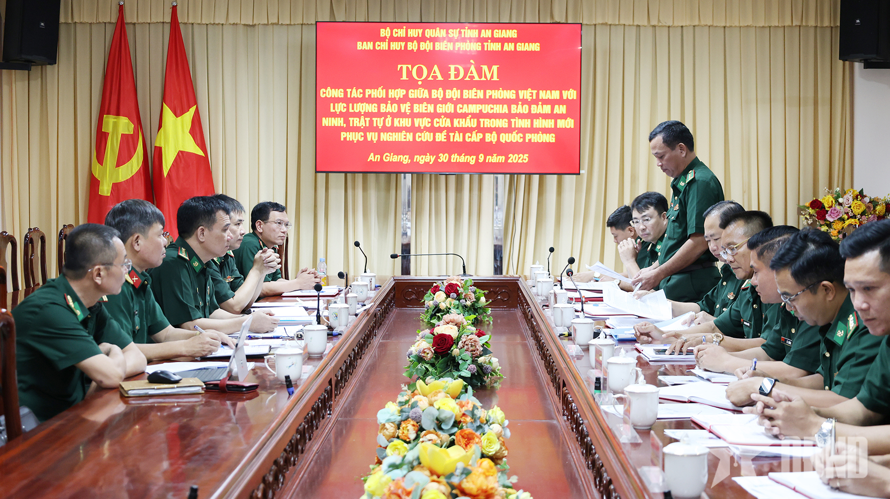 ទិដ្ឋភាពនៃសិក្ខាសាលាស្តីពីការសម្របសម្រួលធានាសន្តិសុខ និងសណ្តាប់ធ្នាប់នៅច្រកទ្វារព្រំដែនវៀតណាម-កម្ពុជា រៀបចំដោយនាយកដ្ឋាន វិទ្យាសាស្ត្រ យោធាការពារព្រំដែន សហការជាមួយបញ្ជាការដ្ឋានការពារព្រំដែនខេត្តអានយ៉ាង។ |