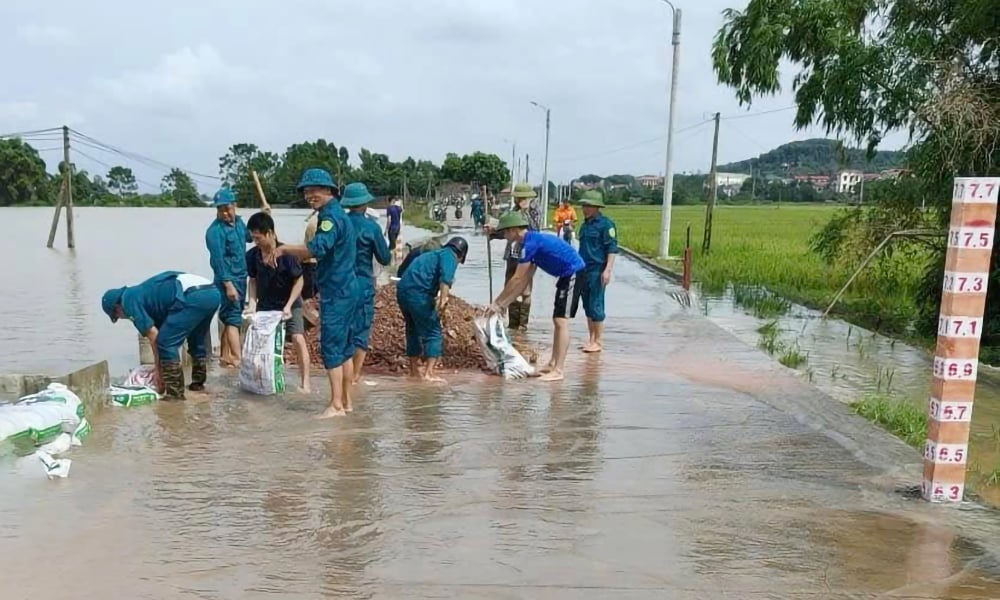 កម្លាំងការពារទឹកជំនន់ និងព្យុះ Van Ha បានដាក់ពង្រាយដំណោះស្រាយ ដើម្បីការពារកុំឱ្យទឹកហូរហៀរទំនប់។ |