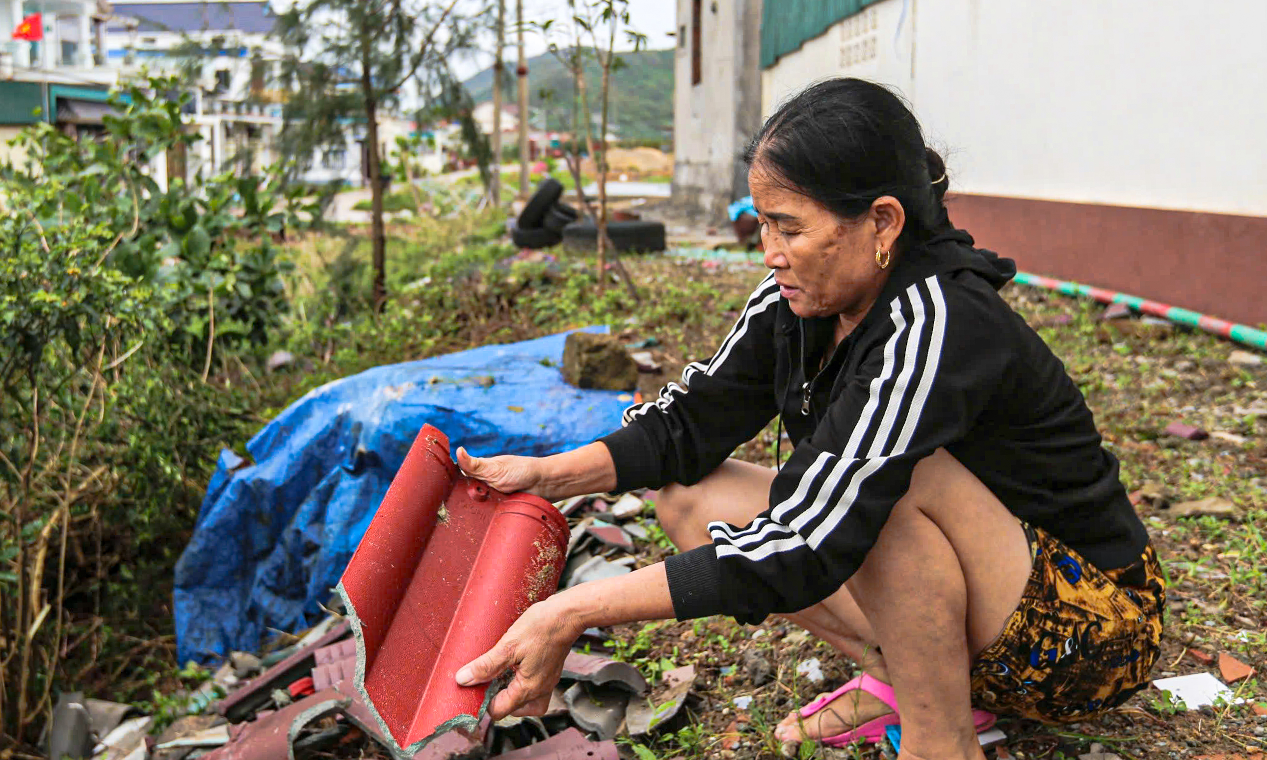 នៅមិនឆ្ងាយប៉ុន្មាន អ្នកស្រី ង្វៀន ធីលូ (ភូមិថាន់បាក) និងកូនប្រុសរបស់គាត់កំពុងរវល់សម្អាតបំណែកឈើ និងដែកជ្រុងដែលនៅសេសសល់ពីផ្ទះចាស់។ អ្នកស្រីបានបន្តថា គ្រួសារទាំងមូលត្រូវបានជម្លៀសទៅផ្ទះវប្បធម៌ឃុំនៅរសៀលថ្ងៃទី២៨ ខែកញ្ញា។ លុះព្រឹកឡើងត្រឡប់មកវិញ ឃើញតែស៊ុមផ្ទះទទេ។ អ្នកស្រី លូ បាននិយាយទាំងក្រៀមក្រំថា "ឃើញទិដ្ឋភាពនេះខ្ញុំស្រក់ទឹកភ្នែក ប៉ុន្តែខ្ញុំមិនអាចអង្គុយបានឡើយ ខ្ញុំត្រូវចាប់ផ្តើមសម្អាត សាងសង់ដំបូលឡើងវិញ ដើម្បីមានកន្លែងស្នាក់នៅបណ្តោះអាសន្ន"។