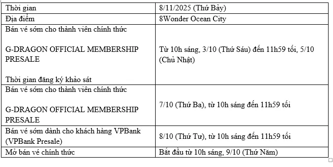 ដូច្នេះហើយ ការលក់សំបុត្រជាមុនសម្រាប់សមាជិកផ្លូវការរបស់ G-DRAGON OFFICIAL MEMBERSHIP នឹងប្រព្រឹត្តទៅចាប់ពីម៉ោង 10:00 ព្រឹក ដល់ 11:59 យប់ (ម៉ោងក្នុងតំបន់) ថ្ងៃទី 7 ខែតុលា (ថ្ងៃអង្គារ)។ ភ្លាមៗនោះ ការលក់សំបុត្រជាមុនសម្រាប់អតិថិជន VPBank (VPBank Presale) នឹងប្រព្រឹត្តទៅចាប់ពីម៉ោង 10:00 ព្រឹក ដល់ 11:59 យប់ (ម៉ោងក្នុងតំបន់) ថ្ងៃទី 8 ខែតុលា (ថ្ងៃពុធ)។ ការលក់សំបុត្រជាផ្លូវការនឹងចាប់ផ្តើមពីម៉ោង 10:00 ព្រឹក ថ្ងៃទី 9 ខែតុលា (ថ្ងៃព្រហស្បតិ៍)។ សូមចូលទៅកាន់ទំព័រលក់សំបុត្រផ្លូវការ៖ vinwonders.com សម្រាប់ព័ត៌មានលម្អិត។