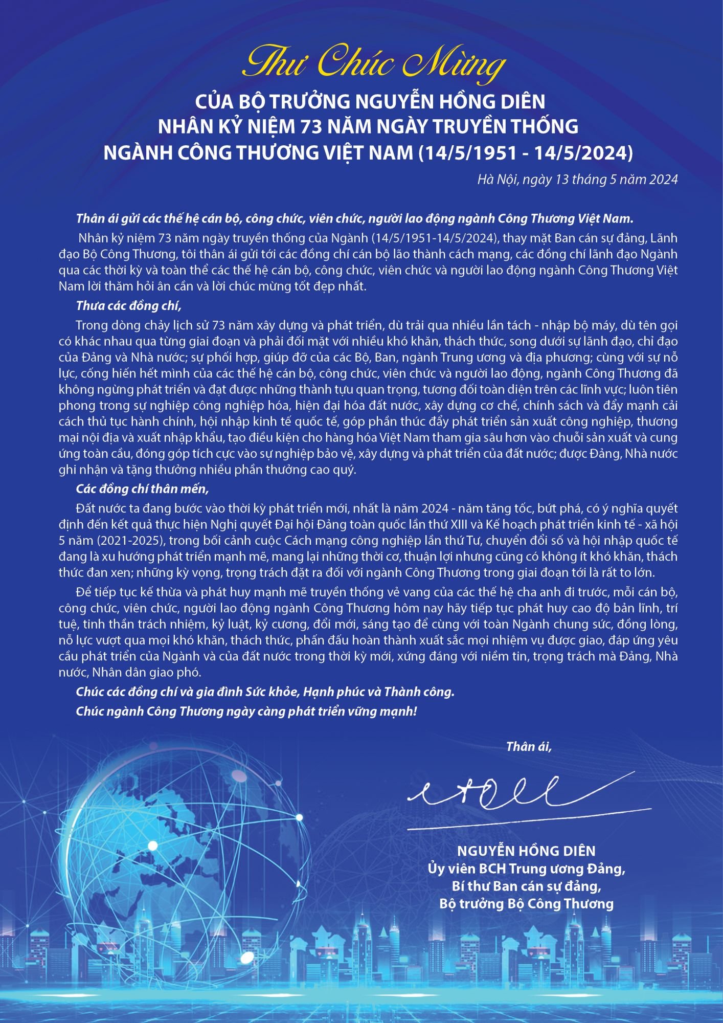 ក្នុងឱកាសរំលឹកខួបលើកទី 73 នៃទិវាប្រពៃណីនៃវិស័យឧស្សាហកម្ម និងពាណិជ្ជកម្មវៀតណាម (14 ឧសភា 1951 - 14 ឧសភា 2024) ក្នុងនាមគណៈកម្មាធិការបក្ស និងថ្នាក់ដឹកនាំក្រសួងឧស្សាហកម្ម និងពាណិជ្ជកម្ម លោករដ្ឋមន្ត្រី Nguyen Hong Dien បានផ្ញើជូនចំពោះកម្មាភិបាល មន្ត្រីរាជការ បុគ្គលិកសាធារណៈ និងកម្មករនៃវិស័យឧស្សាហកម្ម និងពាណិជ្ជកម្មវៀតណាម សូមគោរពជូនពរយ៉ាងកក់ក្តៅបំផុត។ ទំព័រព័ត៌មានអេឡិចត្រូនិក របស់នាយកដ្ឋានឧស្សាហកម្ម និងពាណិជ្ជកម្ម សូមណែនាំខ្លឹមសារទាំងស្រុងនៃលិខិតអបអរសាទររបស់ឯកឧត្តមរដ្ឋមន្ត្រី៖