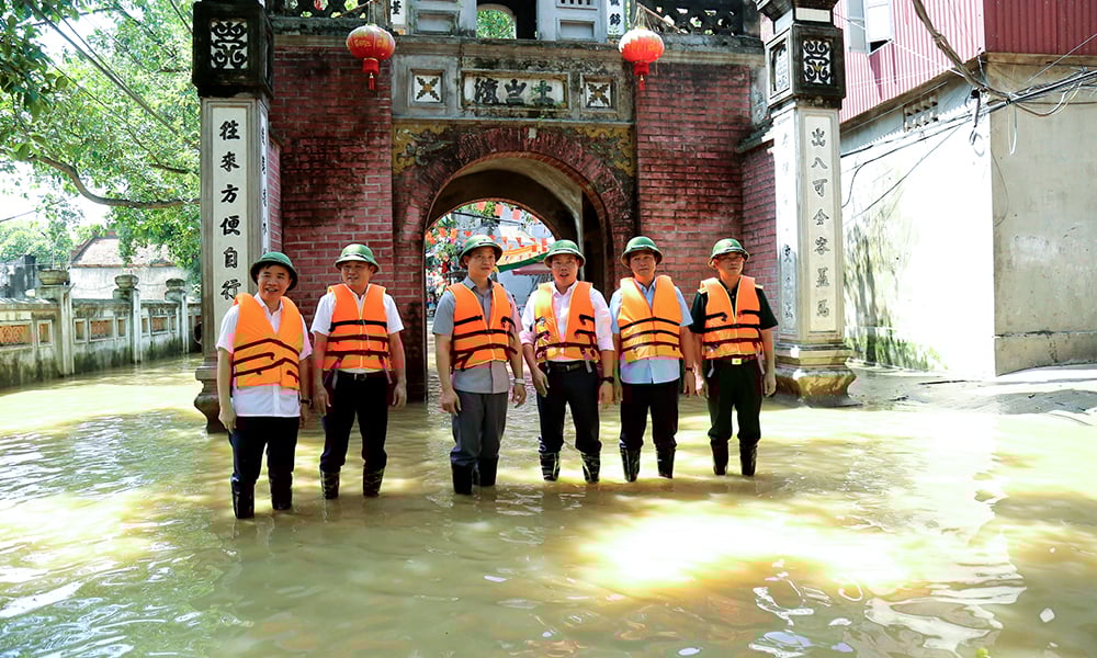 ប្រធានគណៈកម្មាធិការប្រជាជនខេត្ត លោក Vuong Quoc Tuan និងថ្នាក់ដឹកនាំខេត្តបានចុះពិនិត្យស្ថានភាពទឹកជំនន់នៅសង្កាត់ Van Ha។ |