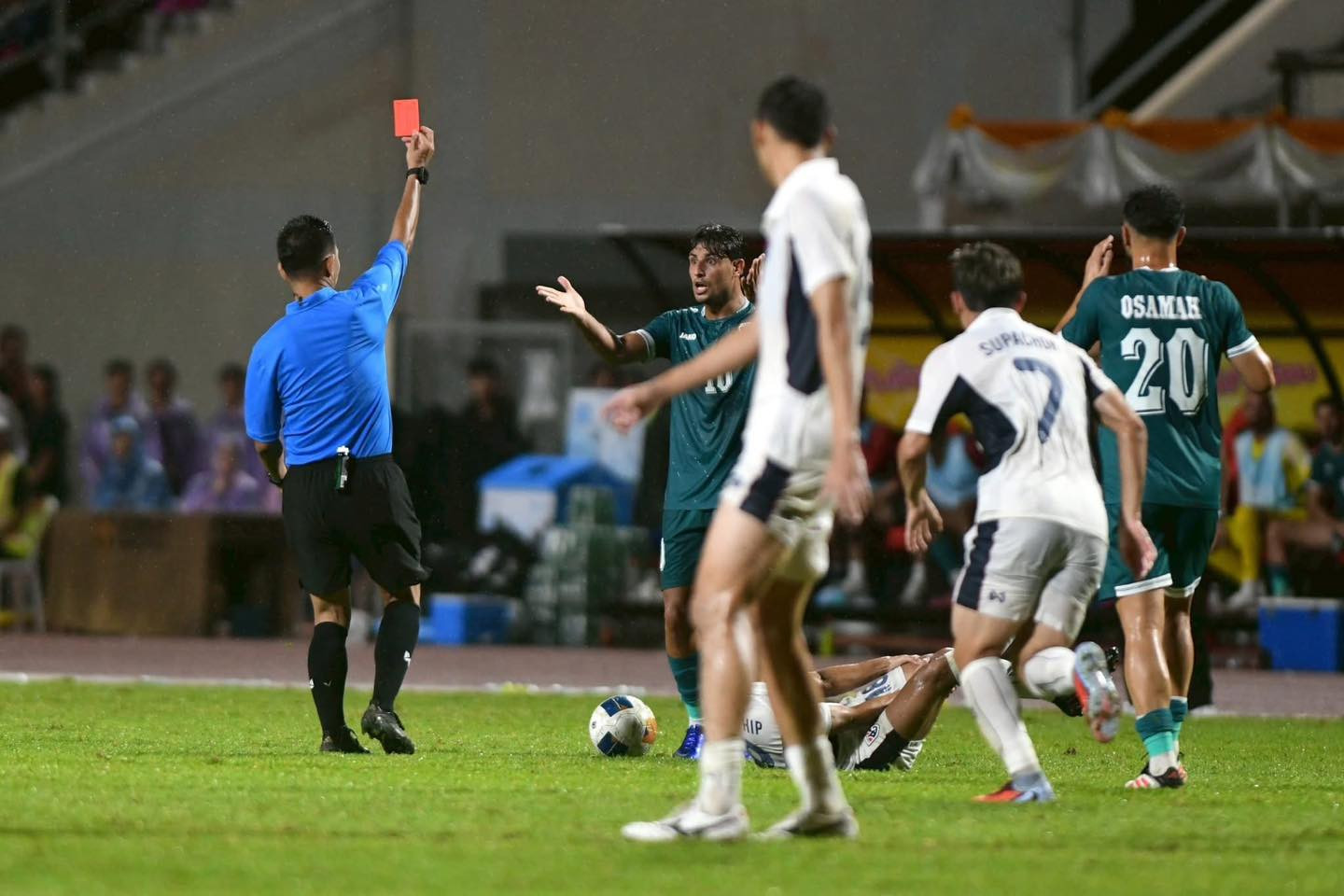 កីឡាករថៃ Messi បានដេកឈឺ ហើយត្រូវដឹកចេញពីទីលាន ខណៈអាជ្ញាកណ្តាលបានផ្តល់កាតក្រហមដល់ Ali ភ្លាមៗ។ ភ្លាមៗនោះ កីឡាករថៃ ស្ទុះទៅបញ្ចេញប្រតិកម្មយ៉ាងចាស់ដៃ បង្កភាពចលាចល ខណៈដែលក្រុមទាំងពីរ និងគ្រូបង្វឹក បានប្រញាប់ប្រញាល់មកកាន់ទីលាន។