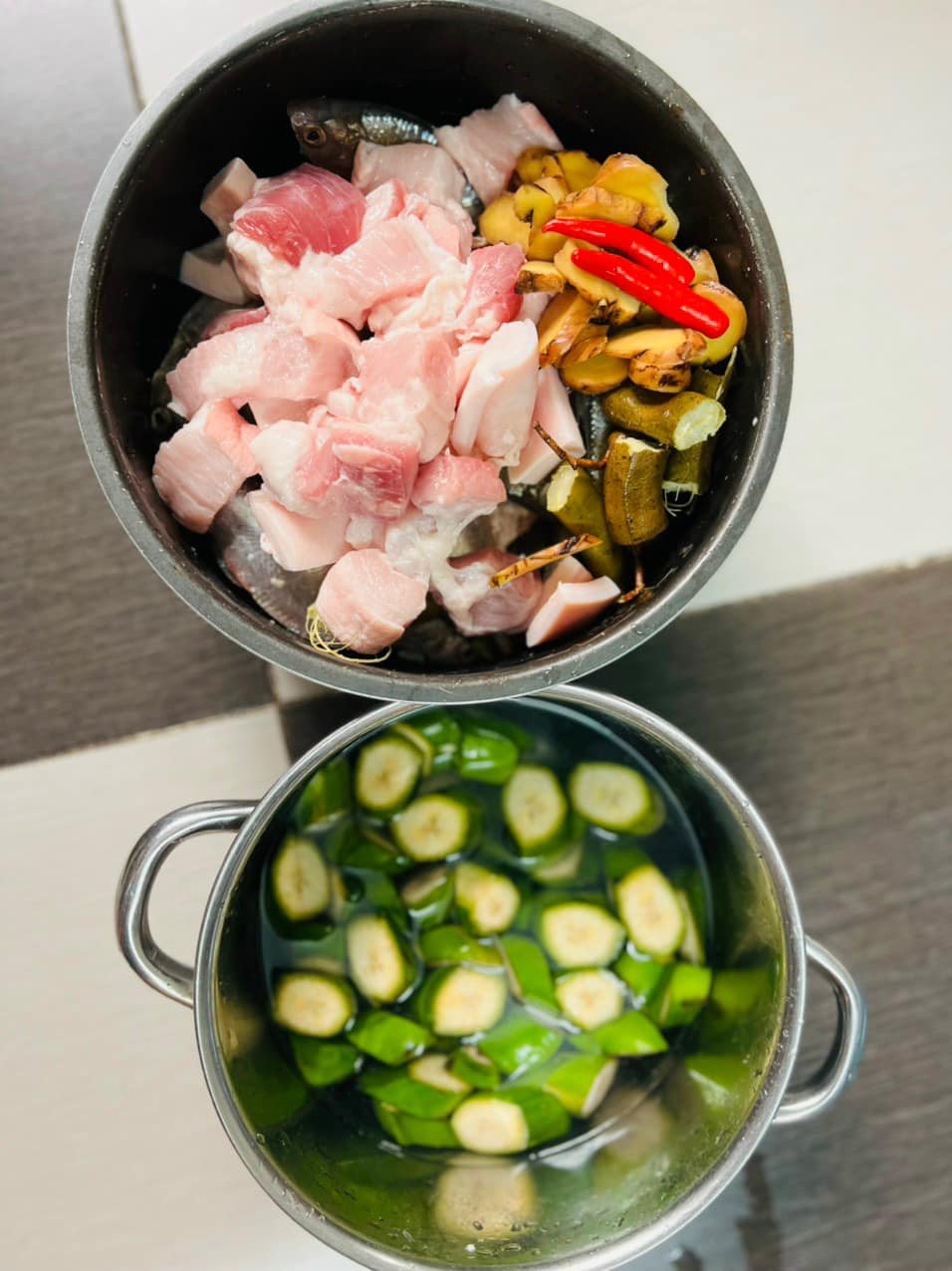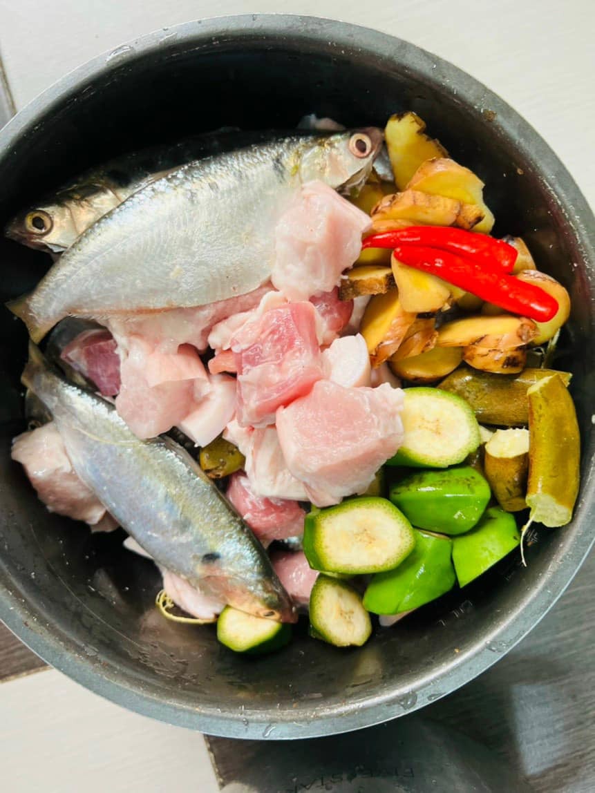 បន្ទាប់ពីសម្អាតរួច គ្រឿងផ្សំត្រូវដាក់ចូលក្នុងឆ្នាំង ទឹកល្មមត្រូវបន្ថែម ហើយដាំឱ្យពុះរហូតដល់ស្ងួត។ ដើម្បីការពារកុំឱ្យត្រីឆេះនៅពេលដែលស្ងោរក្នុងរយៈពេលយូរ មេចុងភៅអាចដាក់បាតឆ្នាំងដោយទឹកអំពៅ បន្ទាប់មកដាក់ត្រី និងគ្រឿងទេសពីលើ។
