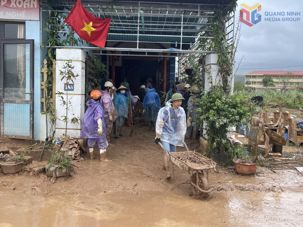 ប្រជាពលរដ្ឋនៅភូមិ Da Trang (ឃុំ Thong Nhat) និងកម្លាំងមូលដ្ឋានចូលរួមសម្អាតភក់បន្ទាប់ពីទឹកជំនន់។ រូបថត៖ Minh Duc