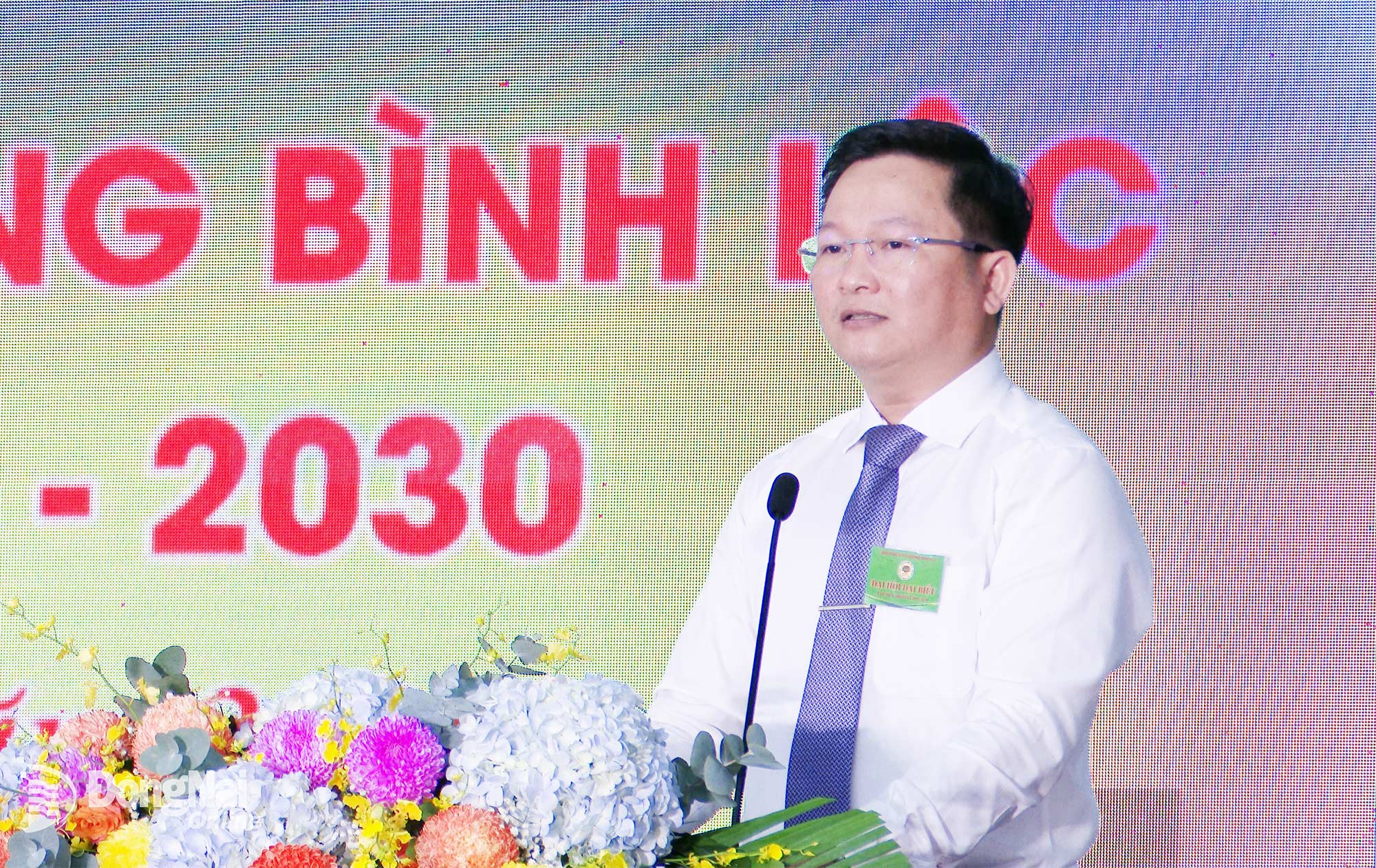 សមាជិកគណៈកម្មាធិការបក្សខេត្ត អនុប្រធានគណៈកម្មាធិការមជ្ឈិមរណសិរ្សមាតុភូមិវៀតណាមខេត្ត ប្រធានសមាគមកសិករ Dong Nai លោក Nguyen Huu Nguyen ជូនផ្កាអបអរសាទរមហាសន្និបាត។ រូបថត៖ Minh Dung |