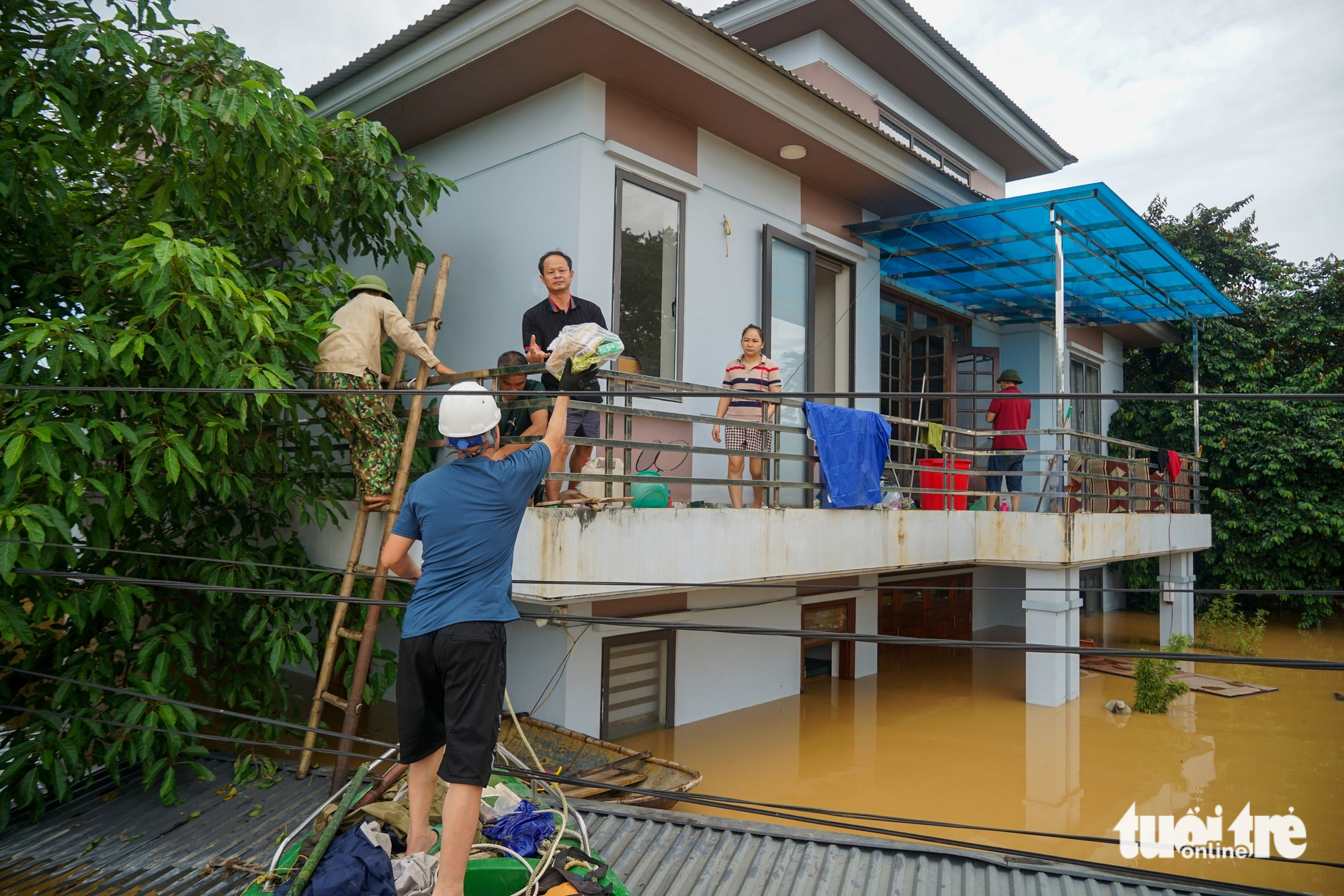 កម្លាំងសង្គ្រោះបាននាំប្រជាពលរដ្ឋនៅតំបន់លិចទឹកទៅកាន់ទីសុវត្ថិភាពនៅព្រឹកថ្ងៃទី៨ តុលា - រូបភាព៖ VU TUAN