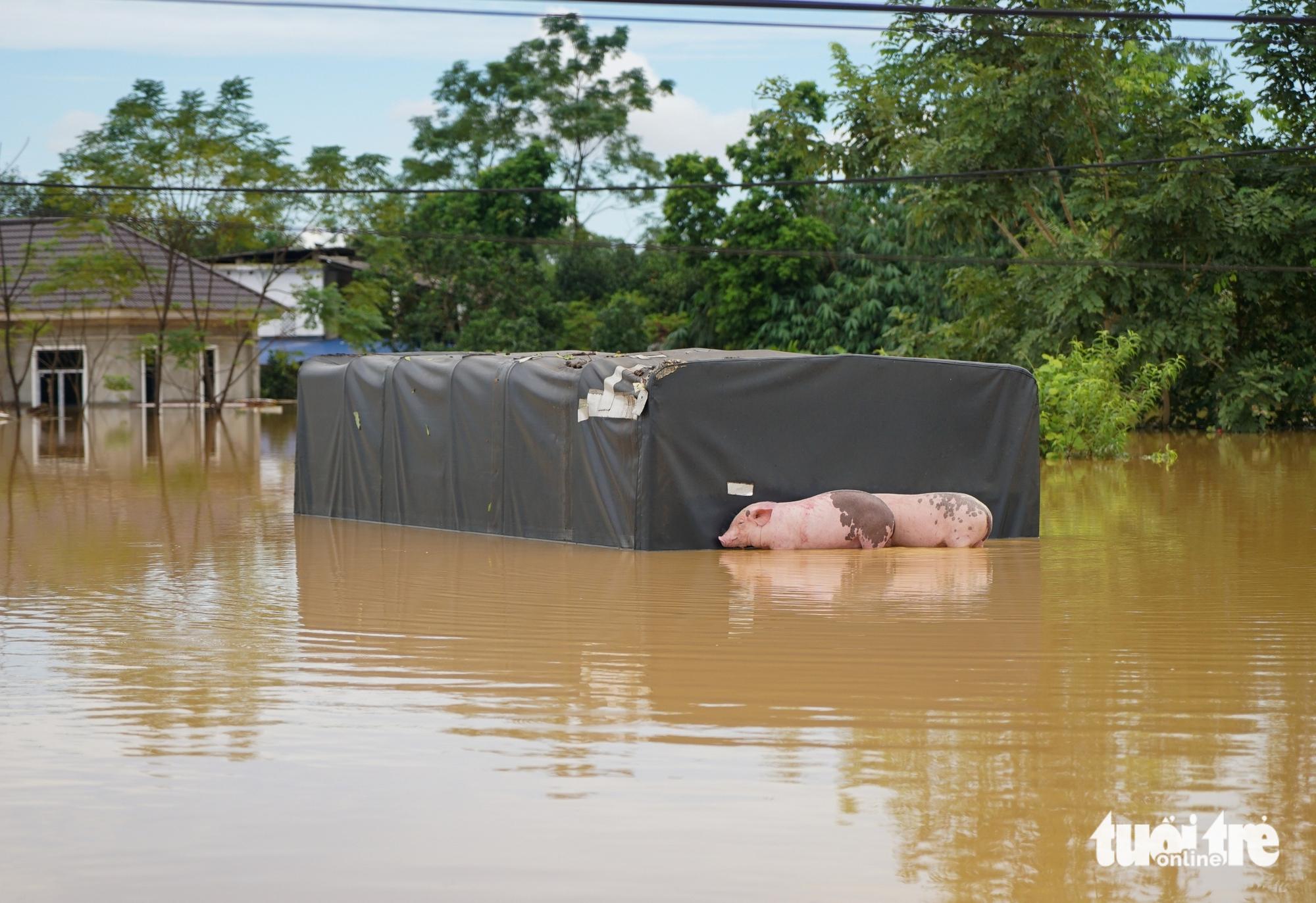 ជ្រូកសំណាងចូលជ្រកលើដំបូលរថយន្តពេលទឹកជំនន់ - រូបថត៖ VU TUAN