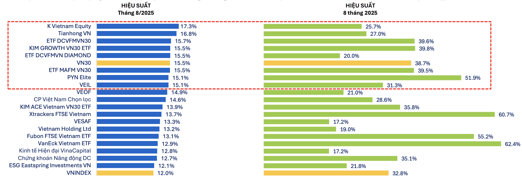 មូលនិធិនាំមុខគេគឺមូលនិធិបរទេស K Vietnam Equity ជាមួយនឹងលទ្ធផល 17.3% ដោយសារផលប័ត្ររបស់ខ្លួនផ្តោតលើភាគហ៊ុនដែលមានមូលធនធំ ជាពិសេសធនាគារ ដែលជាវិស័យមានកំណើនខ្ពស់បំផុតទីពីរបន្ទាប់ពីវិស័យមូលបត្រក្នុងខែសីហា ឆ្នាំ 2025។ ទោះជាយ៉ាងណាក៏ដោយ មូលនិធិនេះពីប្រទេសថៃបានកត់ត្រាការដកប្រាក់សុទ្ធជិត 1,600 ពាន់លានដុងខ្ពស់បំផុតក្នុង 2 ខែកន្លងមក។