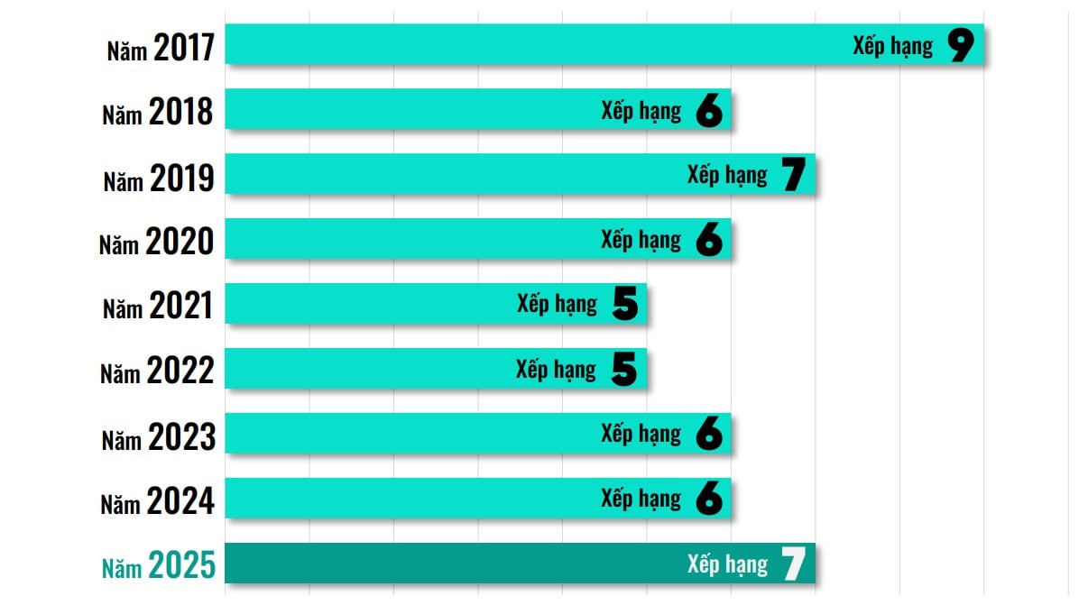 ក្រាហ្វិកបង្ហាញពីចំណាត់ថ្នាក់នៃសន្ទស្សន៍ពាណិជ្ជកម្មអេឡិចត្រូនិករបស់ Dong Nai យោងតាមលទ្ធផលដែលបានប្រកាសក្នុងឆ្នាំ 2017-2025 ដោយសមាគមពាណិជ្ជកម្មអេឡិចត្រូនិកវៀតណាម (Vecom) |
