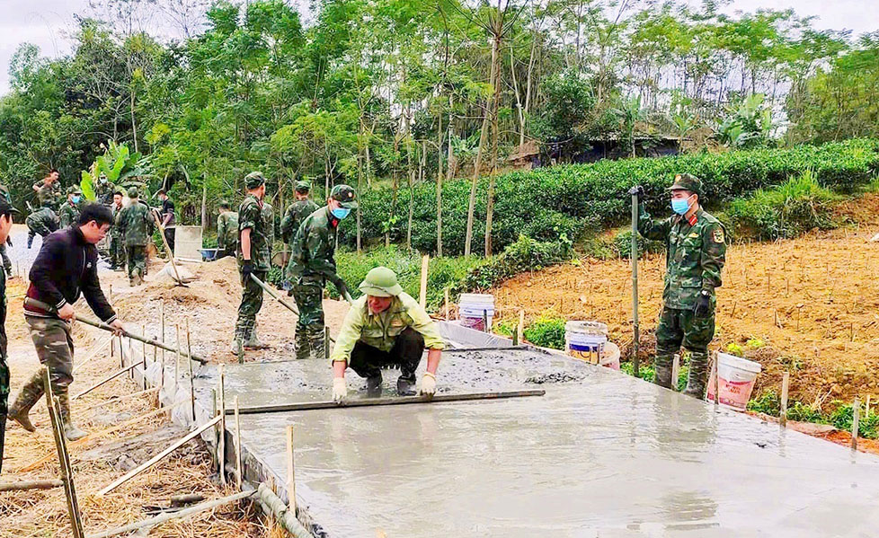 មន្ត្រី និងទាហាននៃកងវរសេនាធំលេខ ២៤៦ សាងសង់ផ្លូវបេតុងនៅឃុំ Phuong Tien ខេត្ត Thai Nguyen