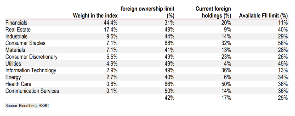 HSBC ជឿជាក់ថាដែនកំណត់នេះមានន័យថានៅពេលដែលអ្នកវិនិយោគបរទេសមានភាគហ៊ុន 50% នៃភាគហ៊ុនរបស់ក្រុមហ៊ុននោះ ពួកគេអាចធ្វើពាណិជ្ជកម្មជាមួយគ្នាដោយបង្កើតតម្លៃទុកសម្រាប់វិនិយោគិនបរទេសដែលបង្កើតភាពខុសគ្នាពីតម្លៃជួញដូរក្នុងស្រុក។ ទោះបីជា FOL មិនមែនជាលក្ខណៈវិនិច្ឆ័យចាំបាច់ក្នុងការវាយតម្លៃរបស់ FTSE ក៏ដោយ នេះអាចជាបញ្ហានៃការព្រួយបារម្ភចំពោះវិនិយោគិន។