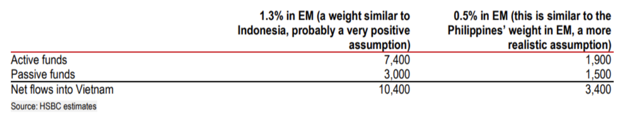 សម្រាប់មូលនិធិសកម្ម មនុស្សជាច្រើនមានវត្តមាននៅវៀតណាមរួចហើយ។ ការកែតម្រូវកត្តានេះ HSBC ប៉ាន់ប្រមាណថាលំហូរដើមទុនពីក្រុមមូលនិធិនេះអាចមានចាប់ពី 1.9 ពាន់លានដុល្លារដល់ 7.4 ពាន់លានដុល្លារ អាស្រ័យលើទម្ងន់របស់វៀតណាមនៅក្នុងសន្ទស្សន៍។
