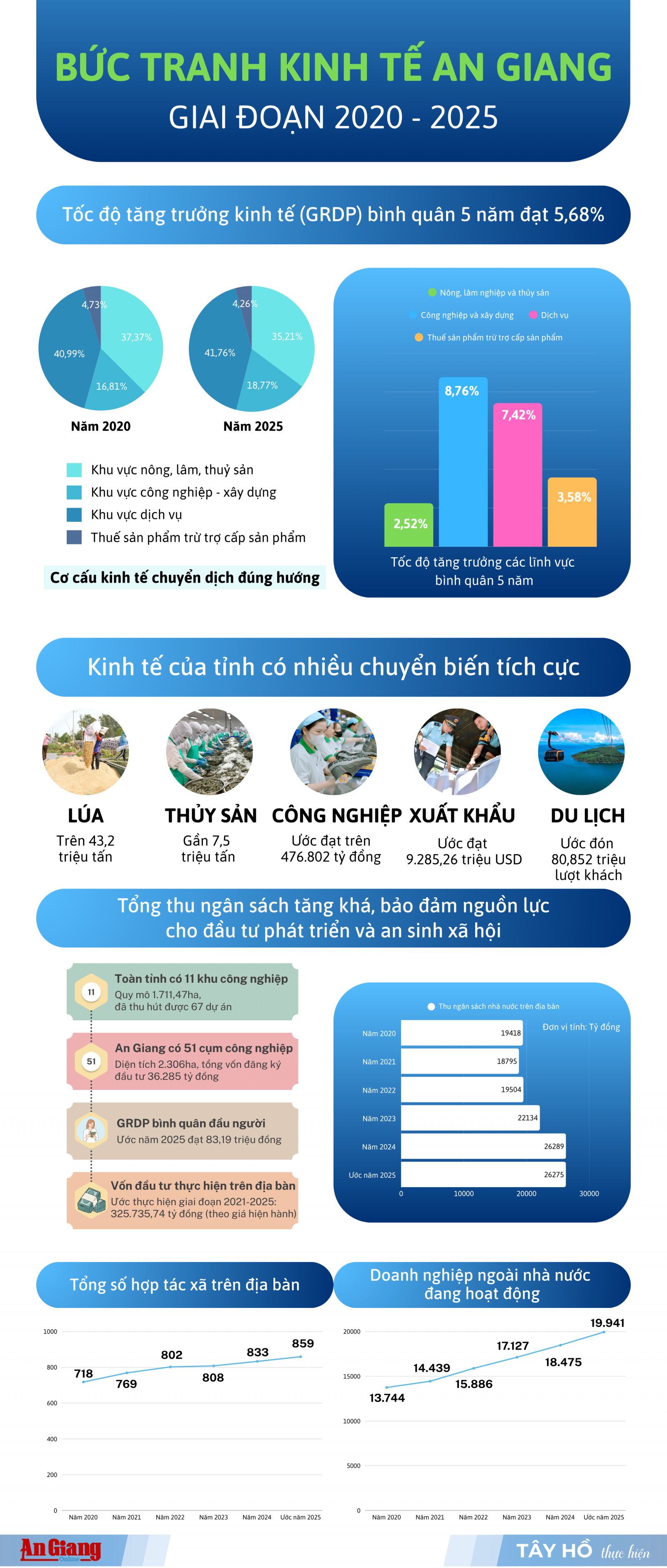 ក្នុងអំឡុងឆ្នាំ ២០២០-២០២៥ សេដ្ឋកិច្ចខេត្ត An Giang សម្រេចបានលទ្ធផលលេចធ្លោជាច្រើន។ អត្រាកំណើន GRDP ជាមធ្យមសម្រាប់រយៈពេលទាំងមូលឈានដល់ 5.68% ក្នុងមួយឆ្នាំ។ តួលេខទាំងនេះបញ្ជាក់ពីកិច្ចខិតខំប្រឹងប្រែងរបស់ខេត្តក្នុងការជម្នះការលំបាក និងសម្របខ្លួនដោយភាពបត់បែនក្នុងបរិបទនៃការប្រែប្រួលសេដ្ឋកិច្ចសង្គមជាច្រើន។