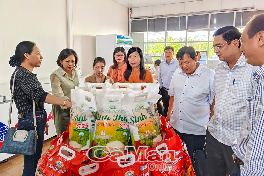 ក្រុមស្ទង់មតិបានទៅទស្សនាស្តង់តាំងបង្ហាញផលិតផល OCOP នៅសហករណ៍ Minh Duy Bon។