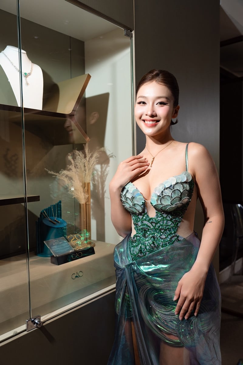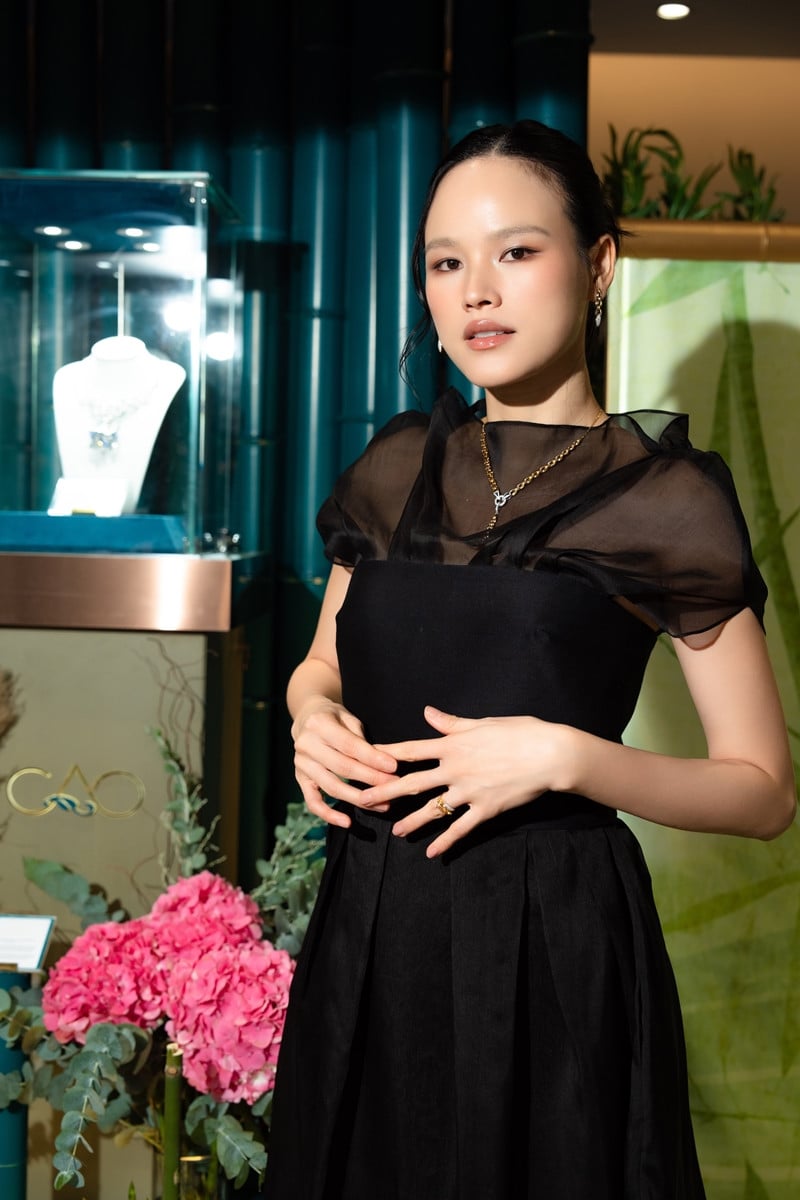 កំពូលតារាម៉ូដែល Lan Khue ទាក់ទាញភ្នែកគ្រប់ៗគ្នា ជាមួយនឹងរូបរាងដ៏ភ្លឺស្វាង និងអាកប្បកិរិយាឆើតឆាយរបស់នាង។ នាងបានជ្រើសរើសឈុតគ្រឿងអលង្ការតម្លៃរាប់សិបពាន់លានដុង ដែលគូសដោយត្បូងពេជ្រភ្លឺចិញ្ចាច។ ការរចនាមានទាំងថ្លៃថ្នូរ និងទន់រលោងពោរពេញទៅដោយរចនាប័ទ្មអាស៊ី។