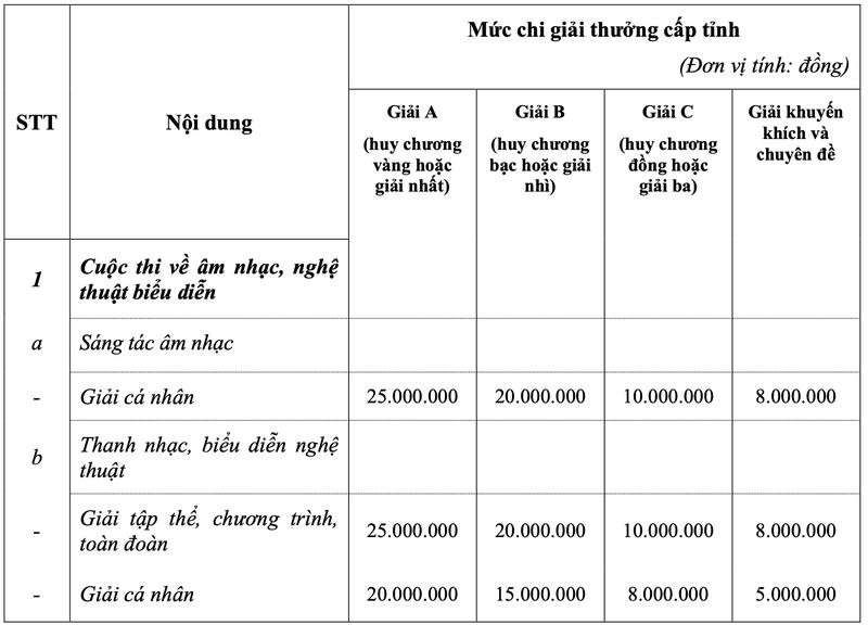 យោងតាមសេចក្តីសម្រេចចិត្ត រង្វាន់ខ្ពស់បំផុតនៅការប្រកួតថ្នាក់ខេត្តគឺ 25 លានដុង ដែលត្រូវបានអនុវត្តចំពោះរង្វាន់ទីមួយក្នុងវិស័យដូចជាការនិពន្ធ តន្ត្រី ចម្លាក់ និងសិល្បៈសម្តែង។ រង្វាន់ផ្សេងទៀតមានចាប់ពី ២០លានដុង ដល់ ២លានដុង អាស្រ័យលើប្រភេទ និងចំណាត់ថ្នាក់។