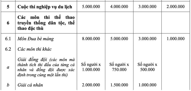 ជាពិសេស ការប្រកួតវិចិត្រសិល្បៈដូចជា គំនូរ និងការរចនា ទទួលបានរង្វាន់ទី១ ចំនួន ២០លានដុង; ការប្រកួតប្រជែងថតរូប និងវីដេអូខ្លី ក៏មានរង្វាន់អតិបរមា 20 លានដុងផងដែរ។ សម្រាប់ការប្រកួតសិល្បៈទ្រង់ទ្រាយធំ រង្វាន់សមូហភាពខ្ពស់បំផុតគឺ ១២ លានដុង ហើយរង្វាន់បុគ្គលគឺ ៥ លានដុង។ ក្នុងវិស័យកីឡាប្រពៃណី ការប្រណាំងក្បូនទទួលបានរង្វាន់ខ្ពស់បំផុតគឺ ៨ លានដុង។