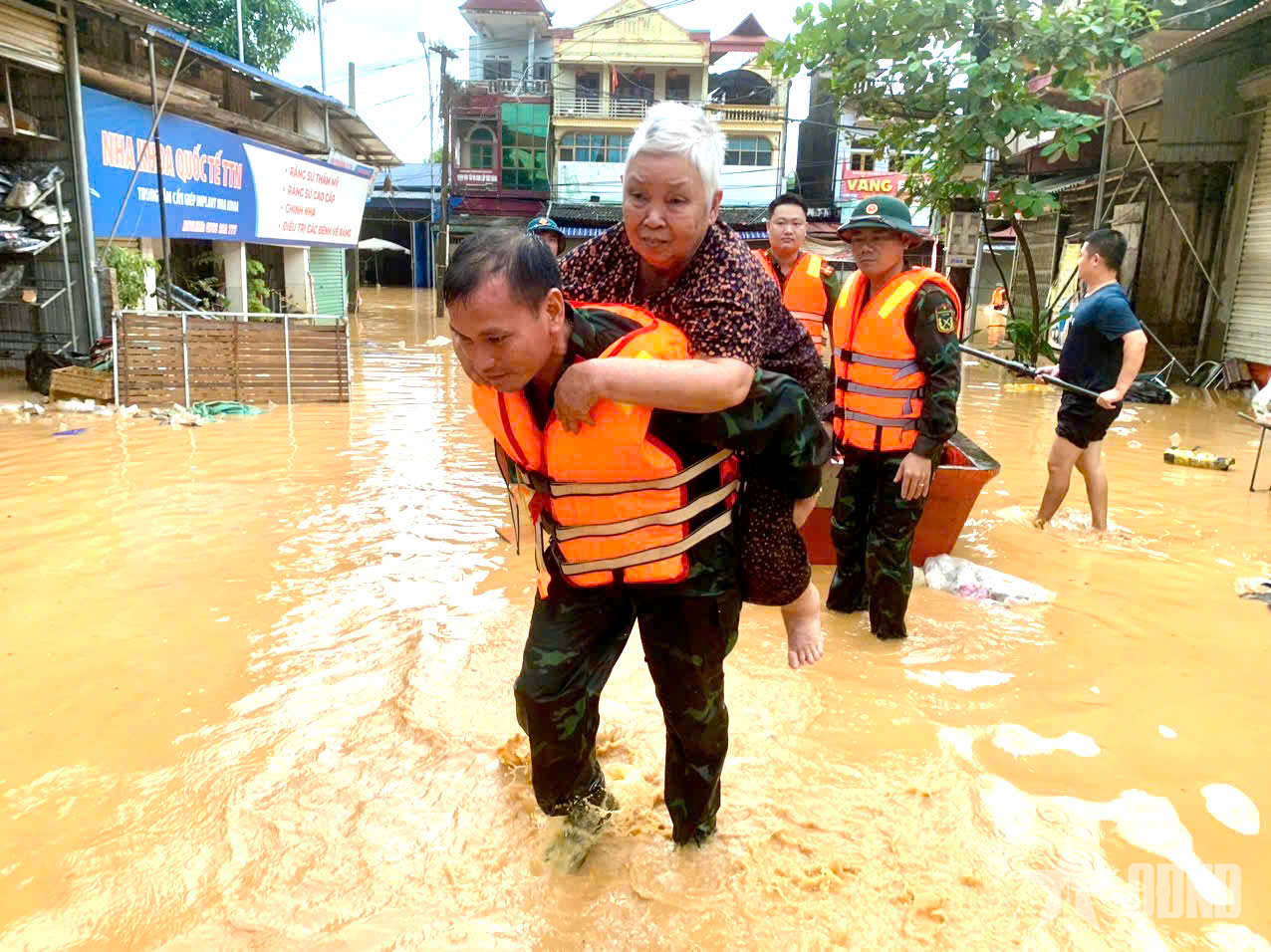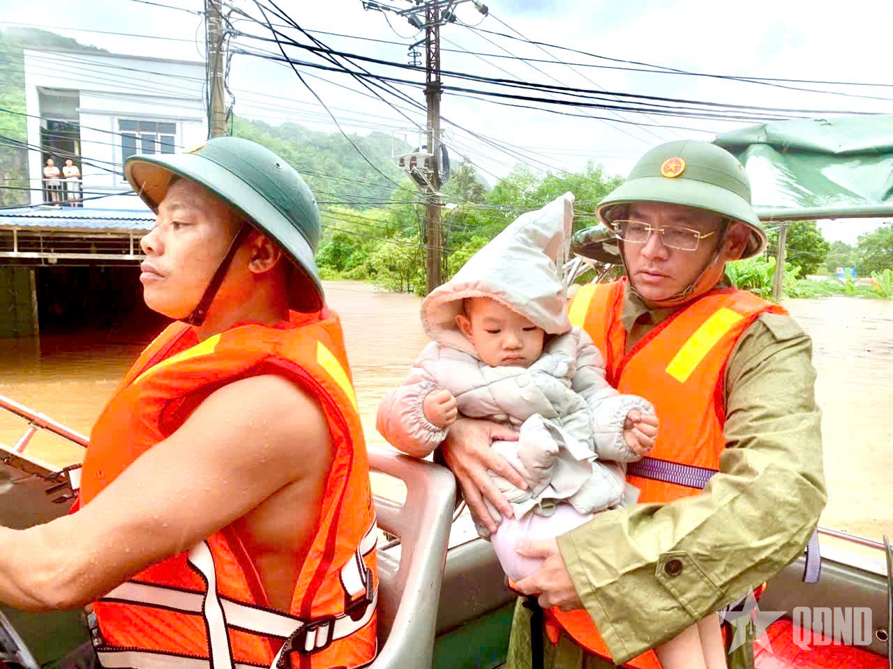 មន្ត្រី និងទាហាននៃបញ្ជាការដ្ឋានយោធាខេត្ត Thai Nguyen ជម្លៀសមនុស្សចាស់ និងកុមារនៅភូមិ Cay Bong ឃុំ Vo Nhai ខេត្ត Thai Nguyen ចេញពីតំបន់លិចលង់។ |