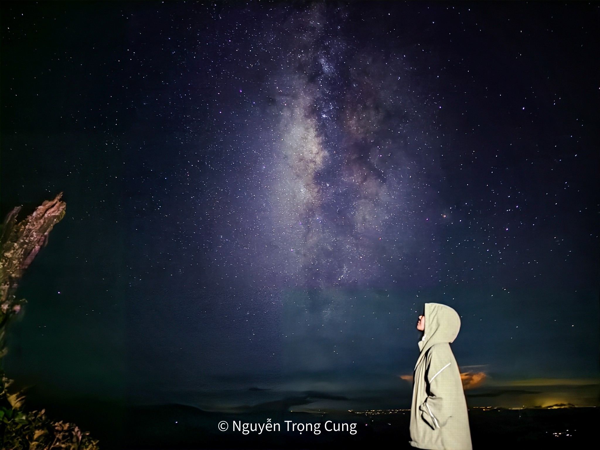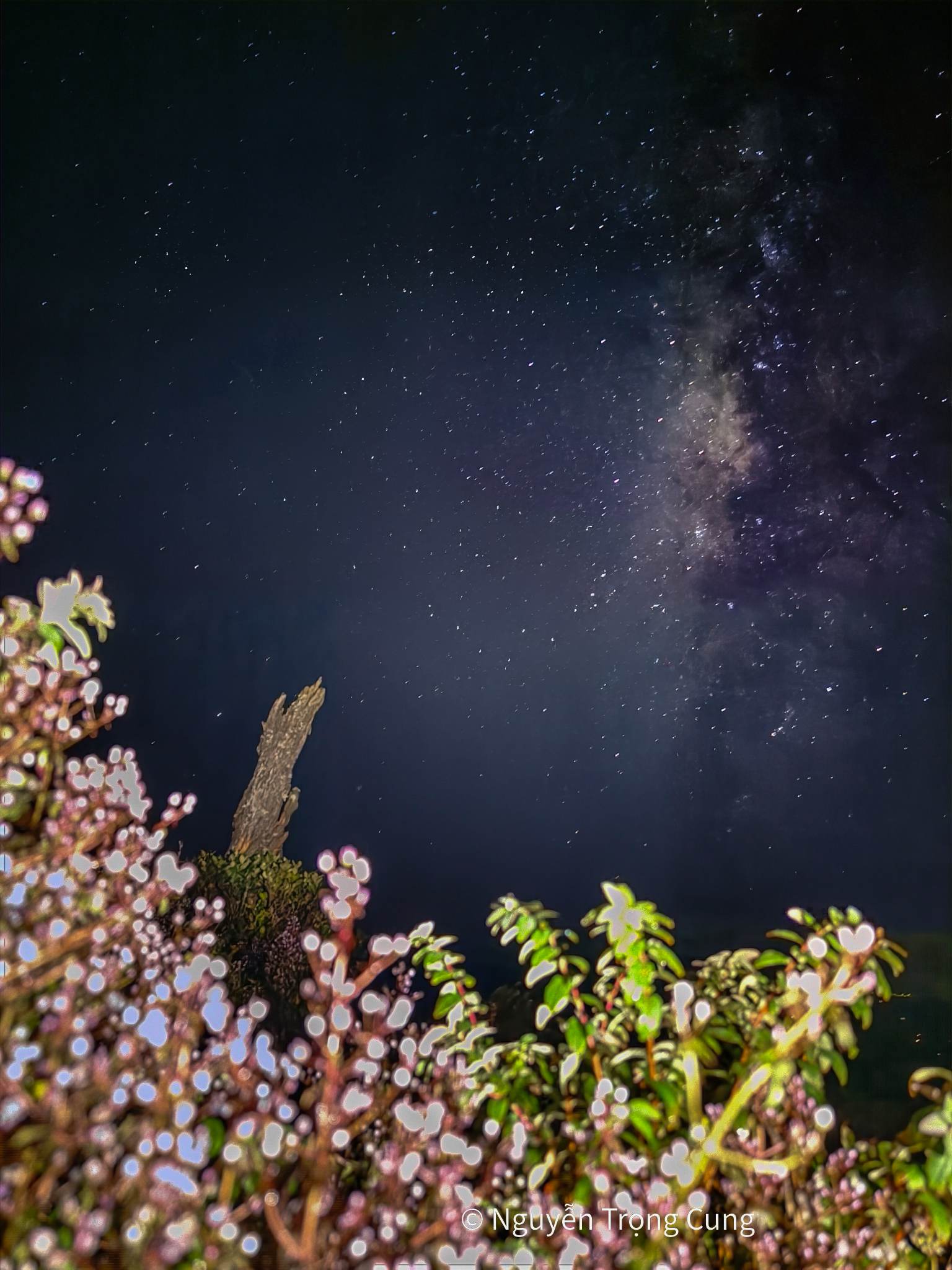 សម្រាប់អ្នកដែលចូលចិត្តការថតរូបតារាសាស្ត្រ នេះជាឱកាសមួយដើម្បីថតយកផ្ទៃមេឃដែលមានផ្កាយគួបផ្សំនឹងដីភ្នំ និងផ្កាពណ៌ស្វាយ។ រូបថត៖ Nguyen Trong Cung