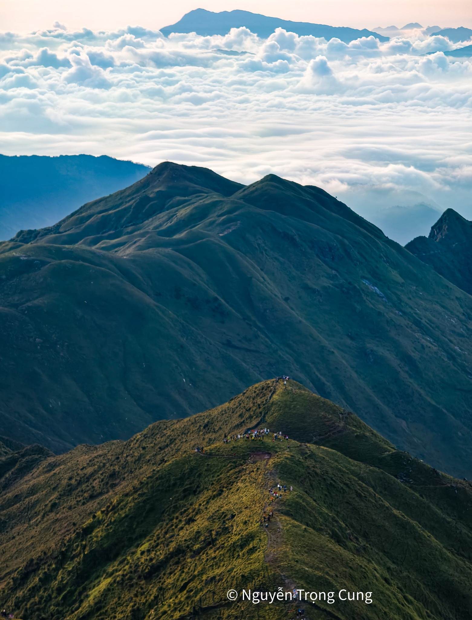 កំពូលភ្នំតាជីញូ មានរយៈកំពស់ប្រហែល 2,979 ម៉ែត្រពីលើនីវ៉ូទឹកសមុទ្រ ដែលចាត់ទុកថាជាកំពូលភ្នំខ្ពស់បំផុត និងលេចធ្លោបំផុតនៅក្នុងតំបន់ភាគពាយ័ព្យ។ រូបថត៖ Nguyen Trong Cung